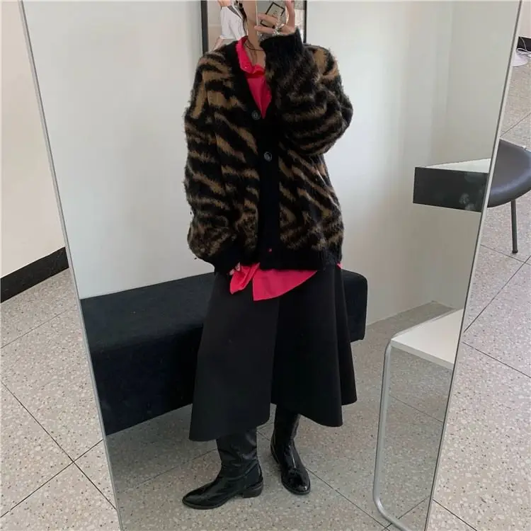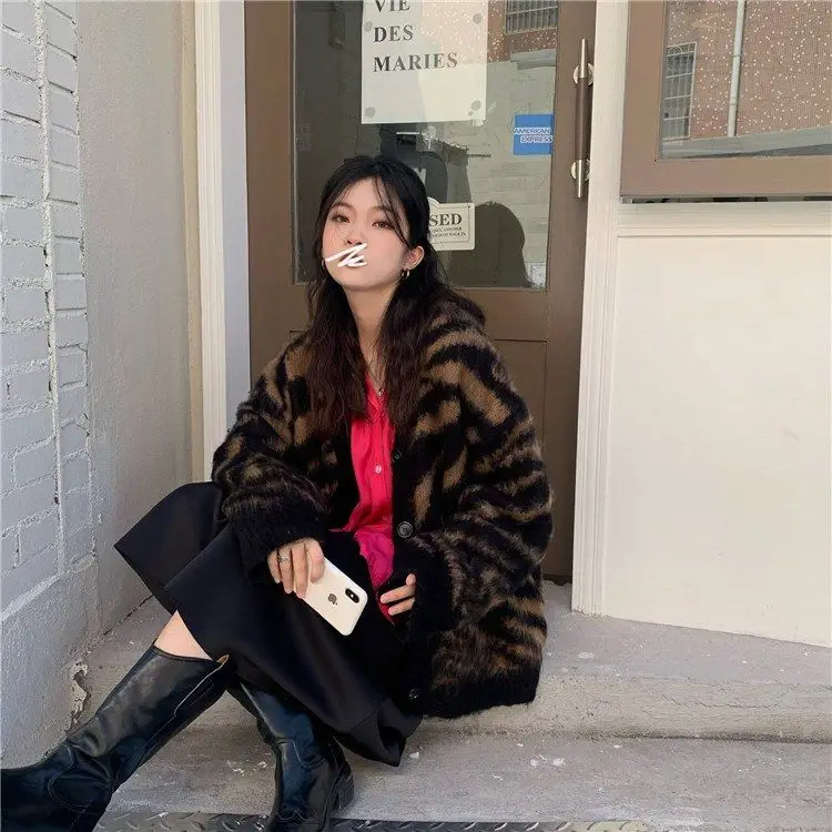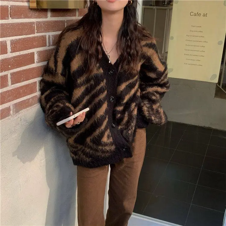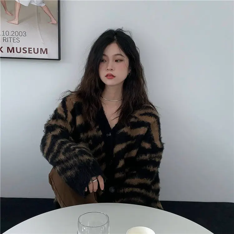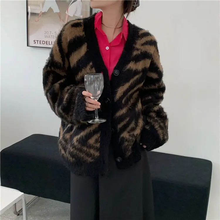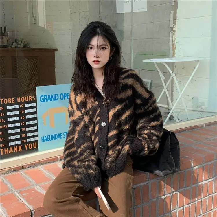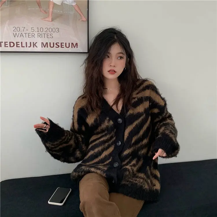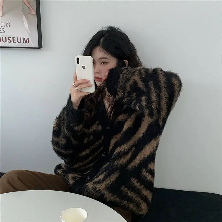 Yipinpay 2023 Autumn Street Style Zebra pattern Knit Women's Sweater Y2K Button Up Loose Long Sleeve Cardigan Coat Winter Outwear