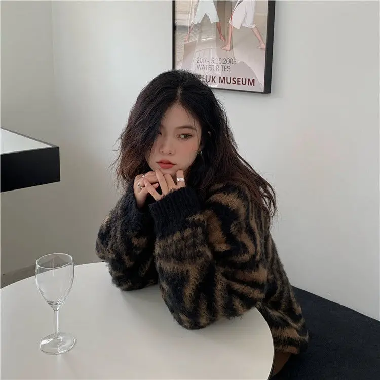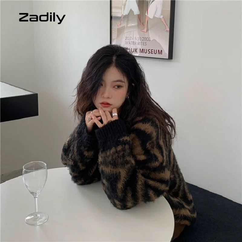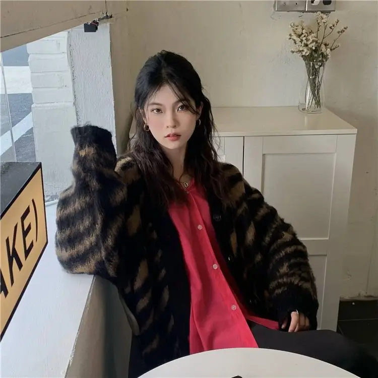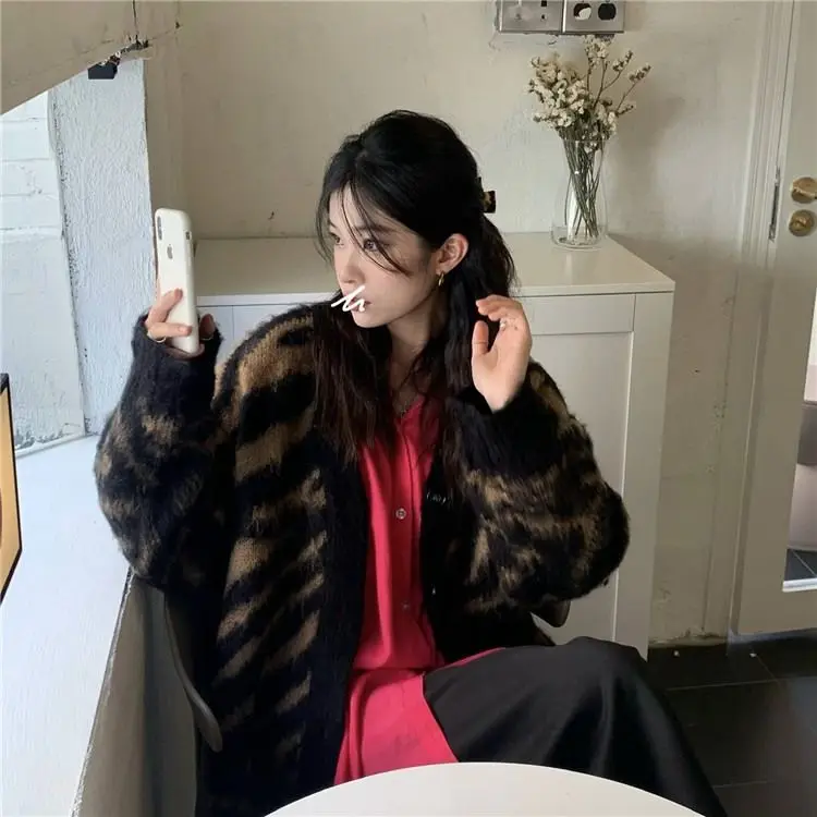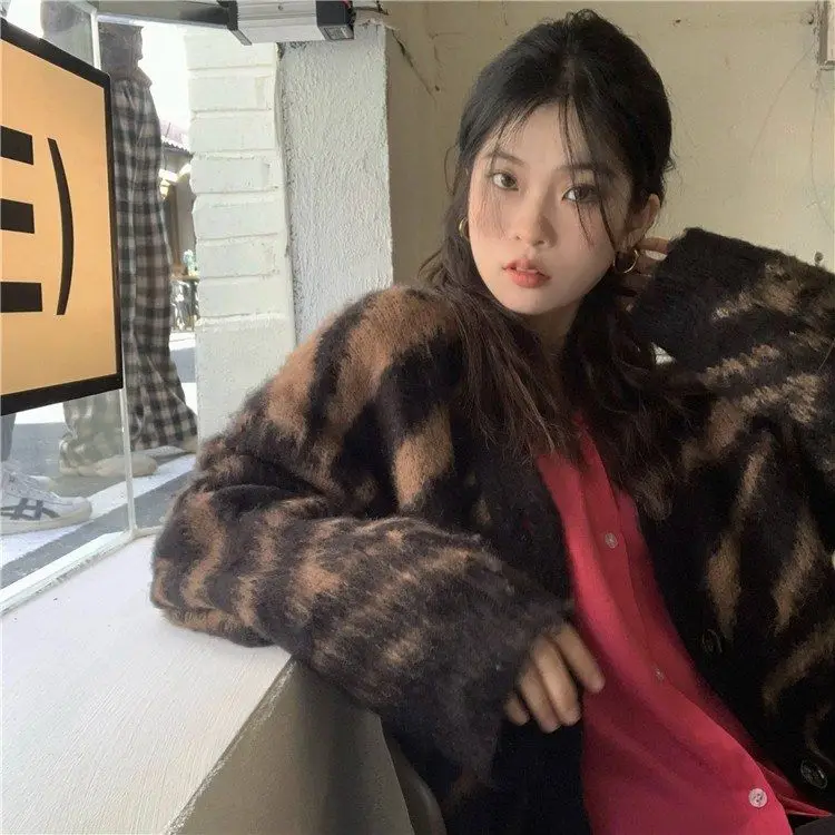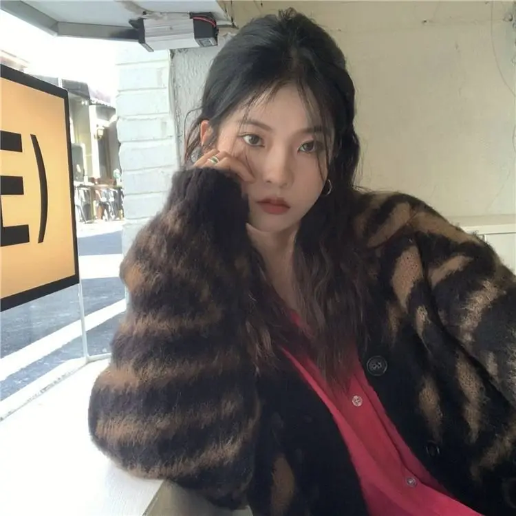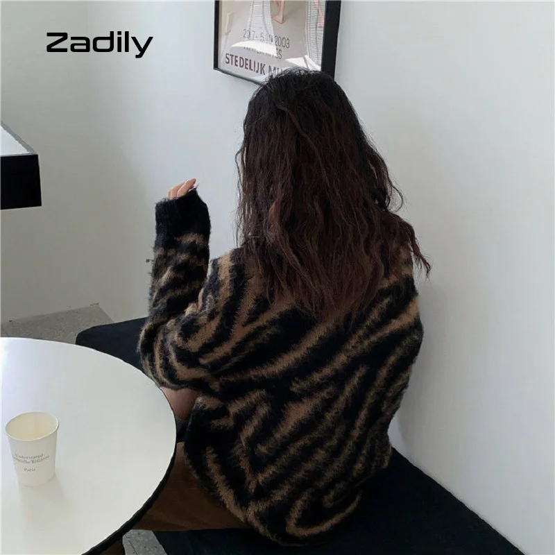 Yipinpay 2023 Autumn Street Style Zebra pattern Knit Women's Sweater Y2K Button Up Loose Long Sleeve Cardigan Coat Winter Outwear