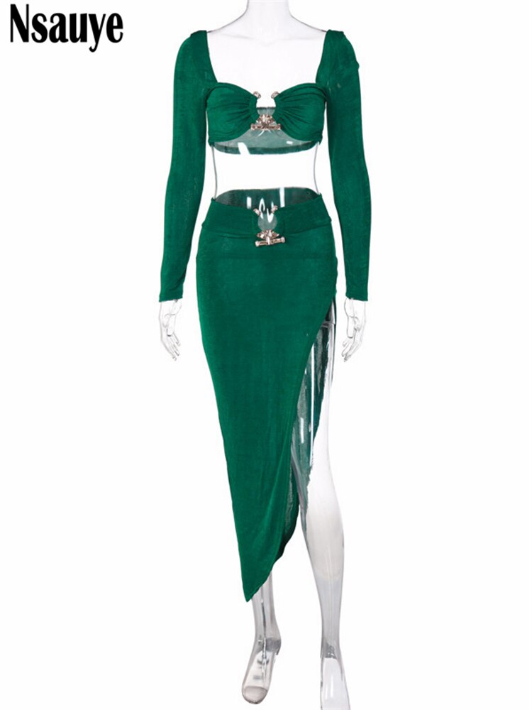 yipinpay 2023 Autumn Summer Club Fashion Long Sleeve Women Crop Tops And Sexy Long Hight Waisted Split Skirt Dress Two Piece Set