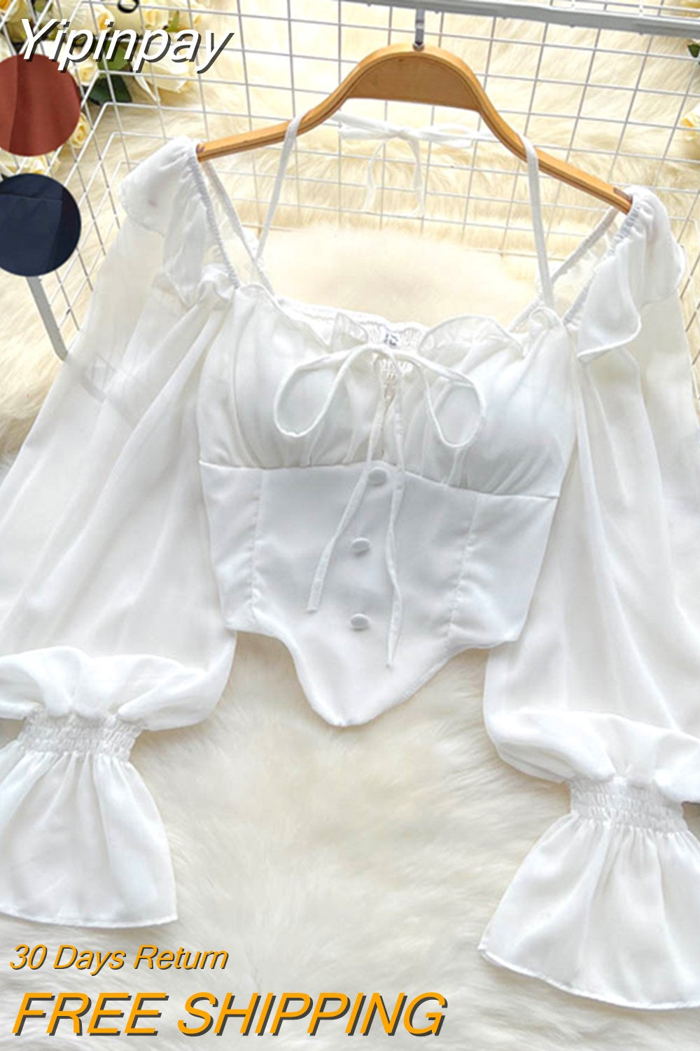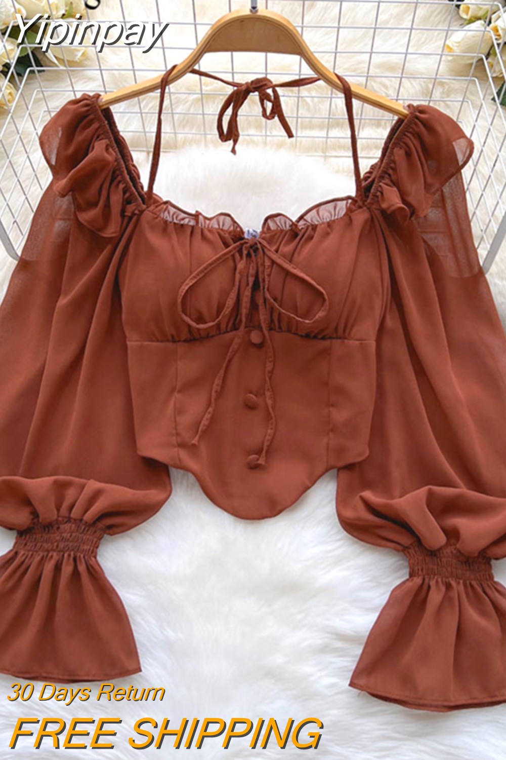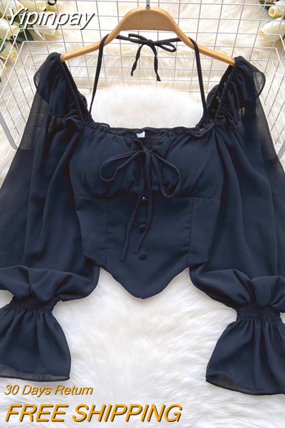 Yipinpay 2023 Fashion French Blouses Shirts Women Solid Color Casual Sexy Long Sleeve Blusas Female Chiffon Lace-up Crop Tops