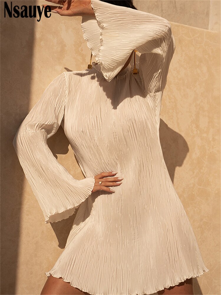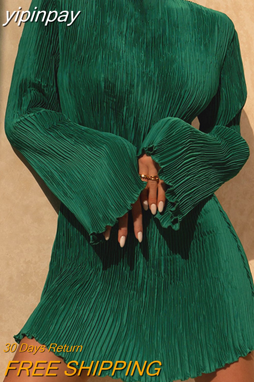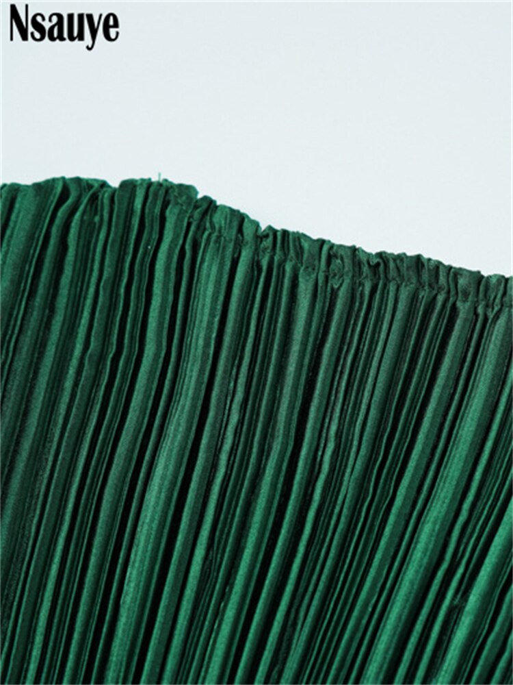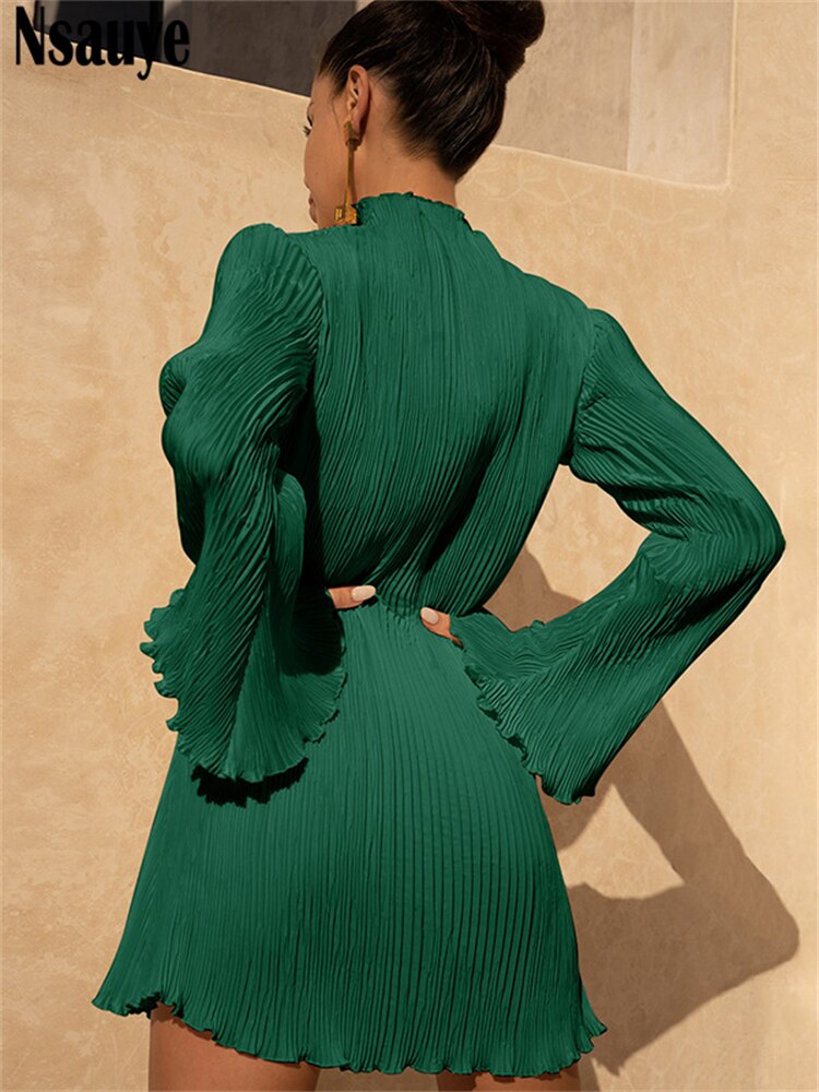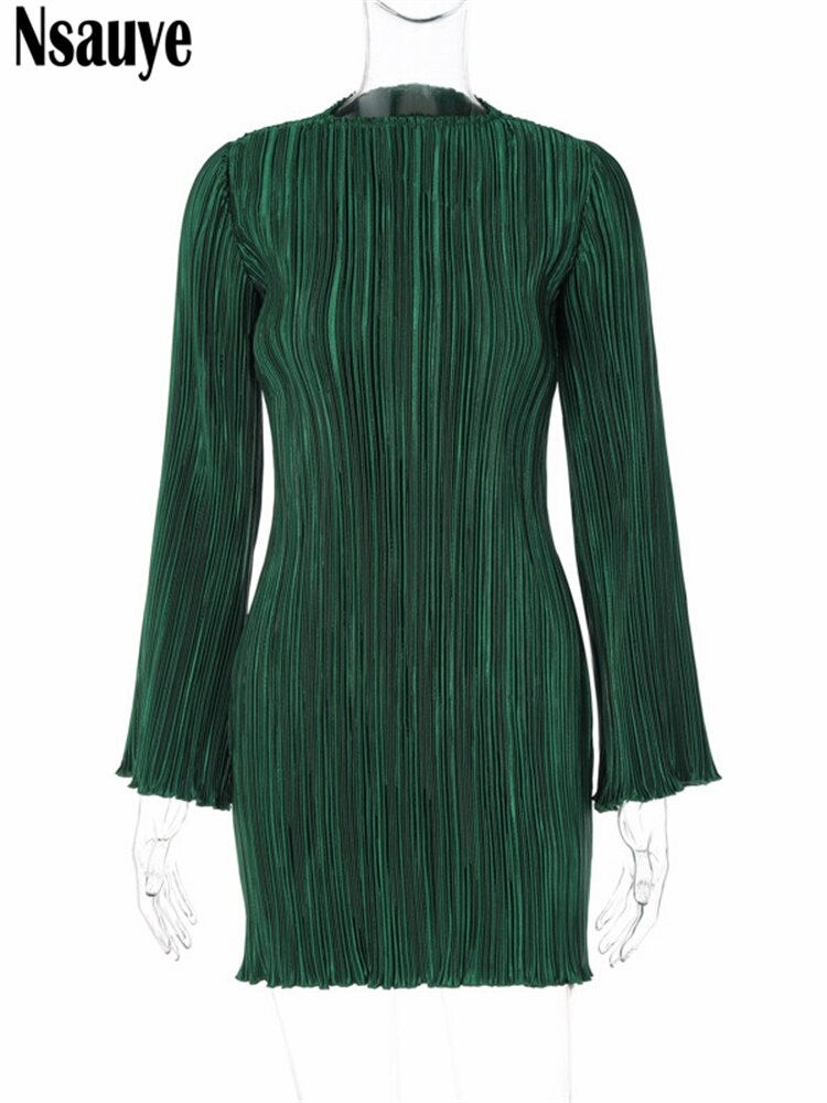 yipinpay 2023 Fashion Green Club Sexy Pleated Mini Wrap Dress Women Outfits Long Sleeve O Neck Evening Party Dress Elegant Autumn