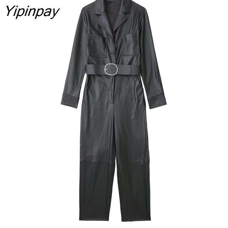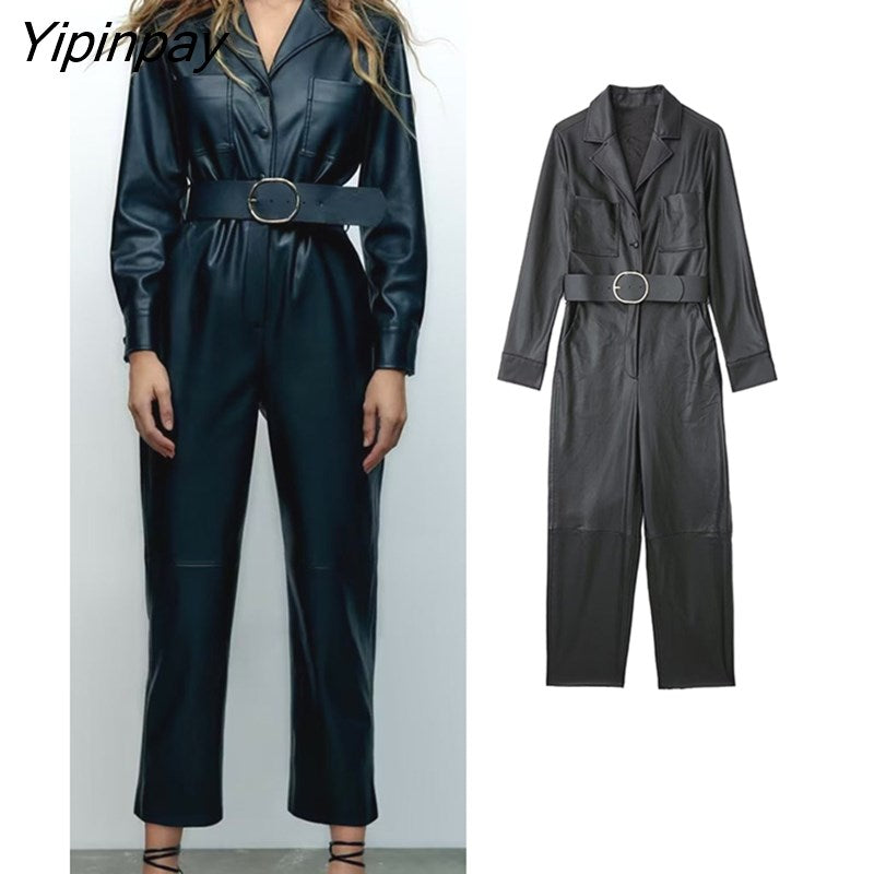 Yipinpay 2023 Fashion Women Faux Leather Jumpsuits With Belt Spring Autumn Vintage Long Sleeve Notched Female Causal Playsuits Mujer