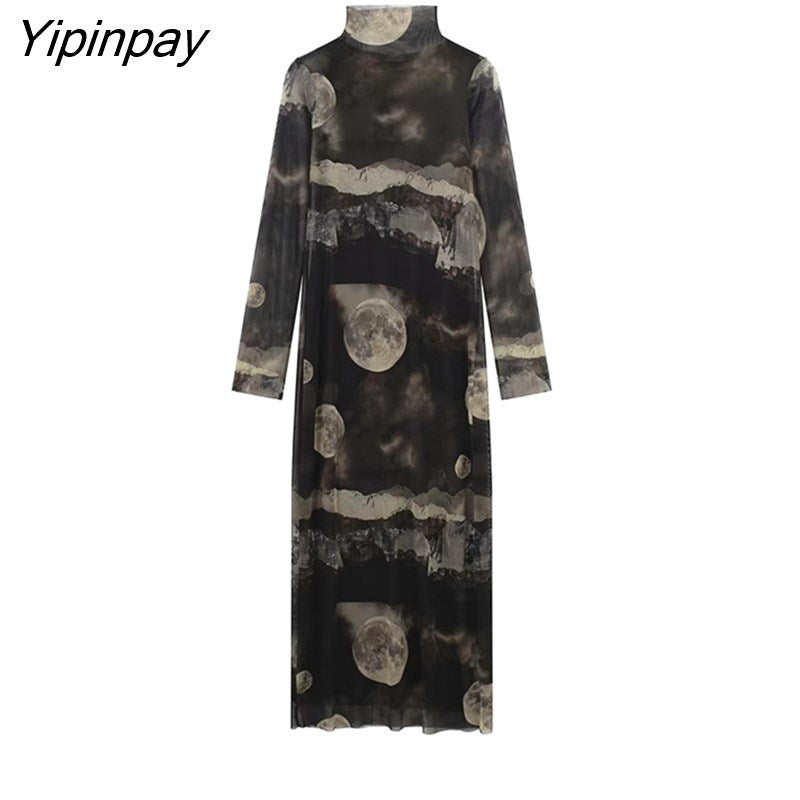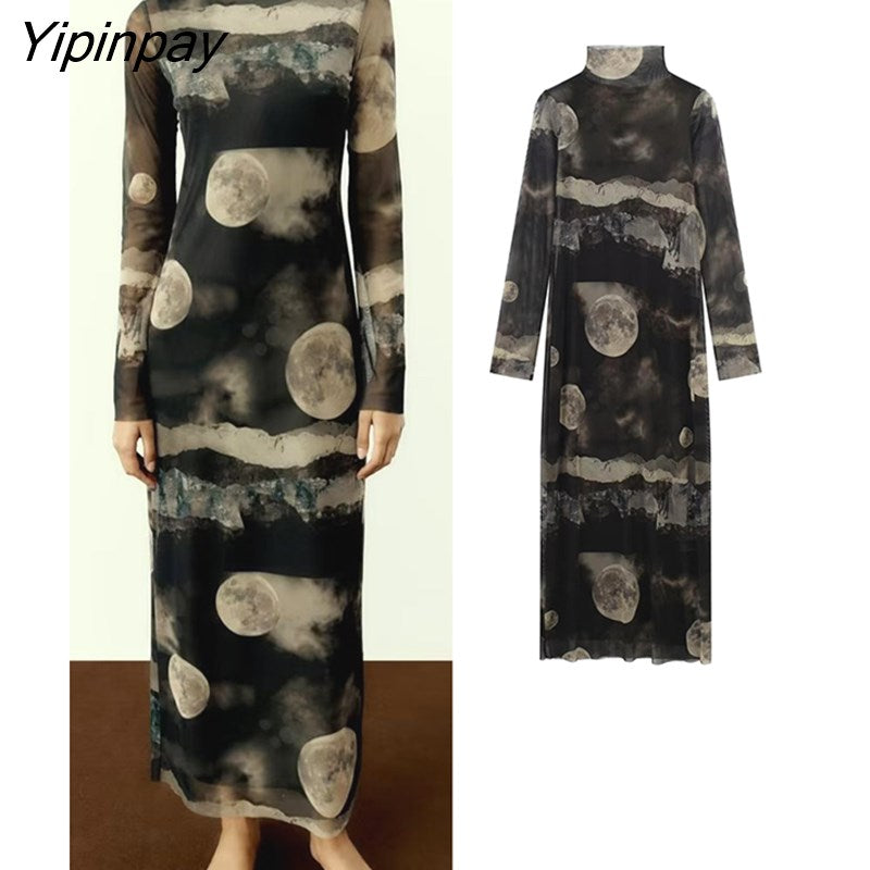 Yipinpay 2023 Ladies Printed Tulle Dresses Vintage Elegant Party Sheath Mid-Calf Dress Long Sleeve Turtleneck Vestidos Spring Autumn
