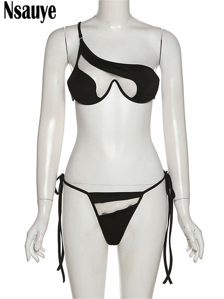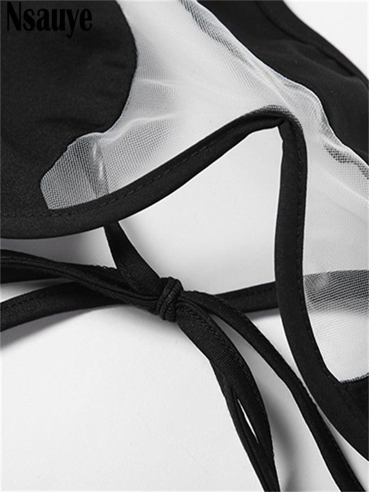 yipinpay 2023 New Women Sexy Bikini Black Swimsuit Two Piece Swimwear Mesh Summer Beach Bikini Set Fashion Lace Up Swimming Suit
