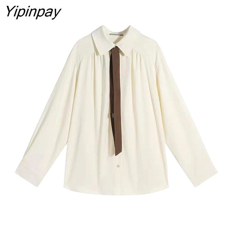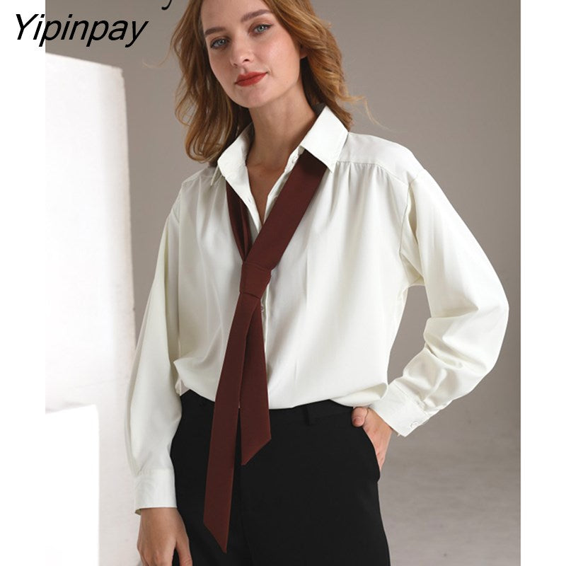 Yipinpay 2023 Spring Office Lady Long Sleeve Folds Women Basic Shirt Minimalist Tie Button Up Loose Woman Tunic Blouse Clothing