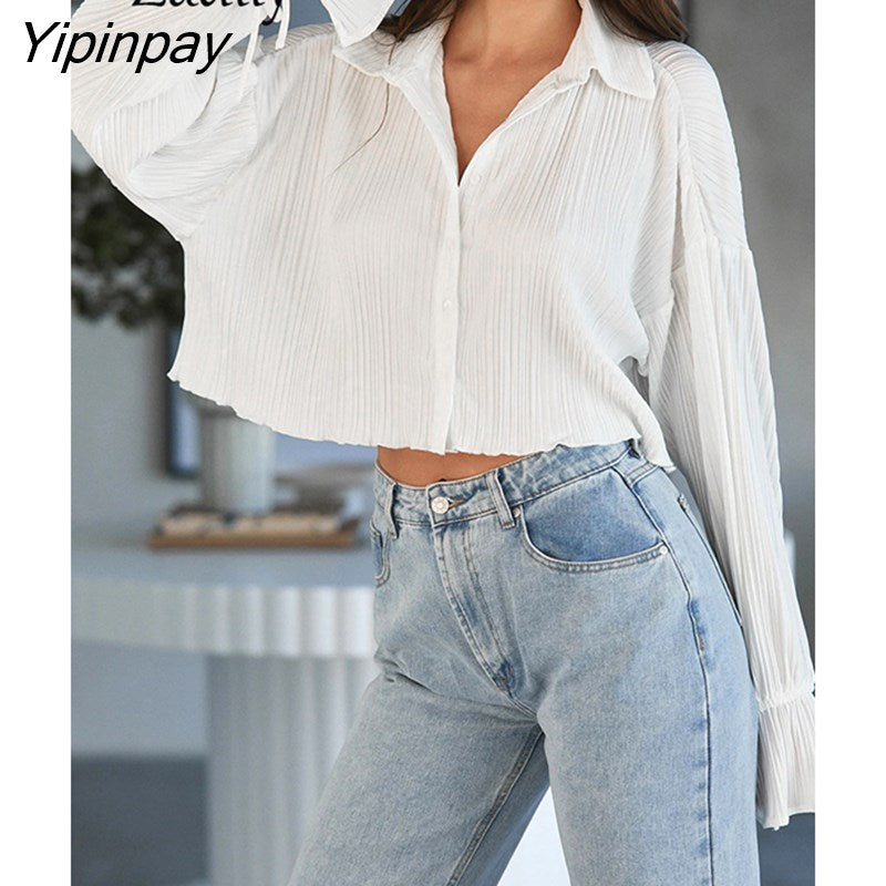 Yipinpay 2023 Spring Sexy Folds Flare Long Sleeve Women White Shirt Korea Style Button Up Woman Crop Tops Blouse Female Clothing