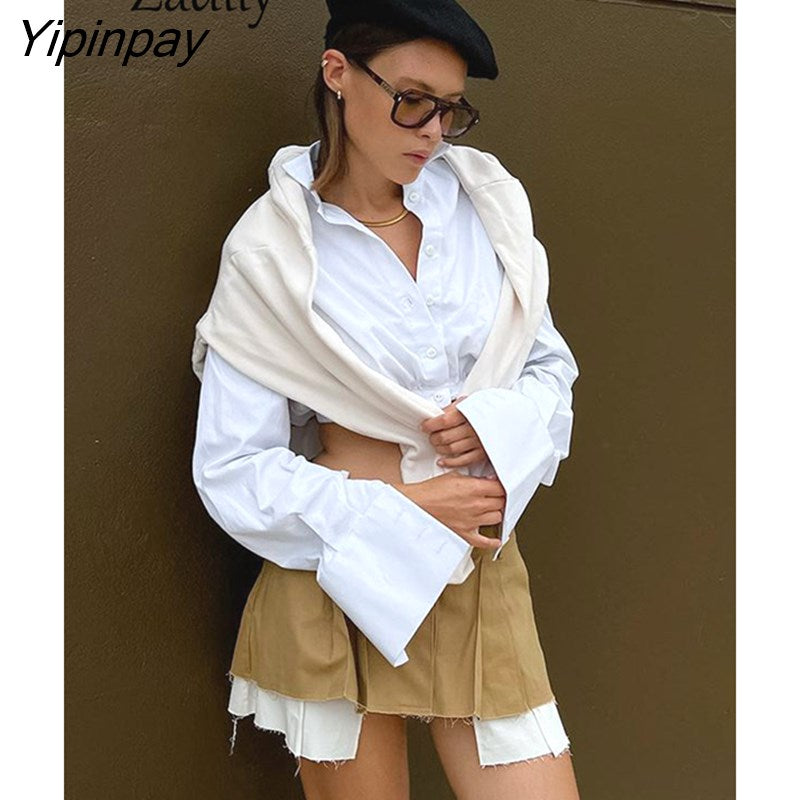 Yipinpay 2023 Spring Y2K Long Sleeve Women Shirt Women Minimalist Button Up Woman Crop Tops Blouse Korea Style Female Clothing