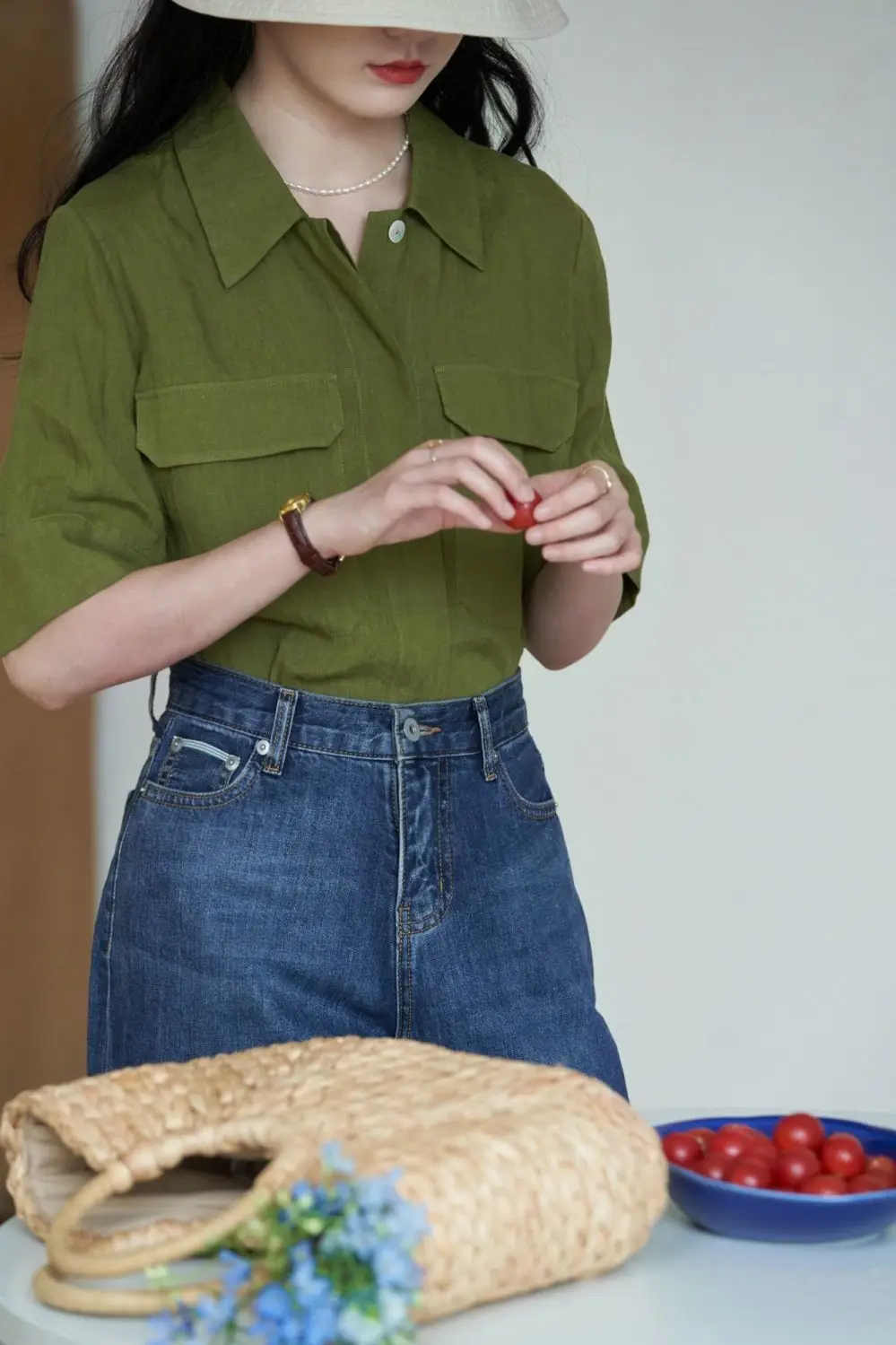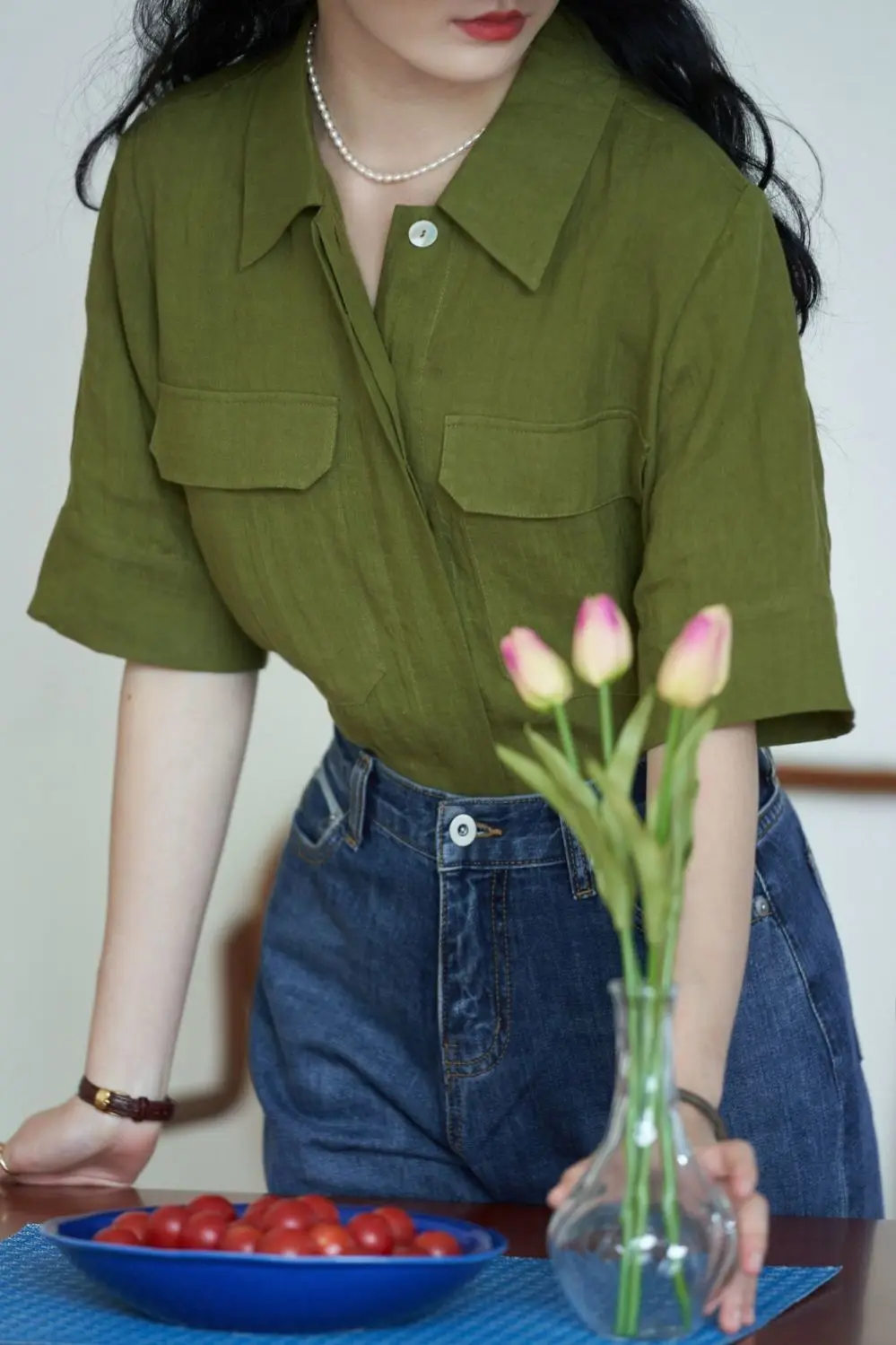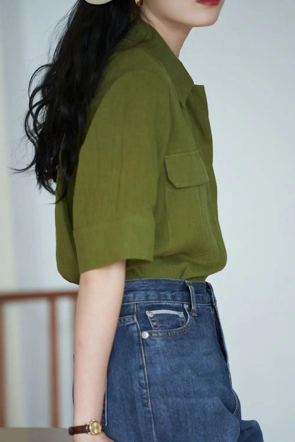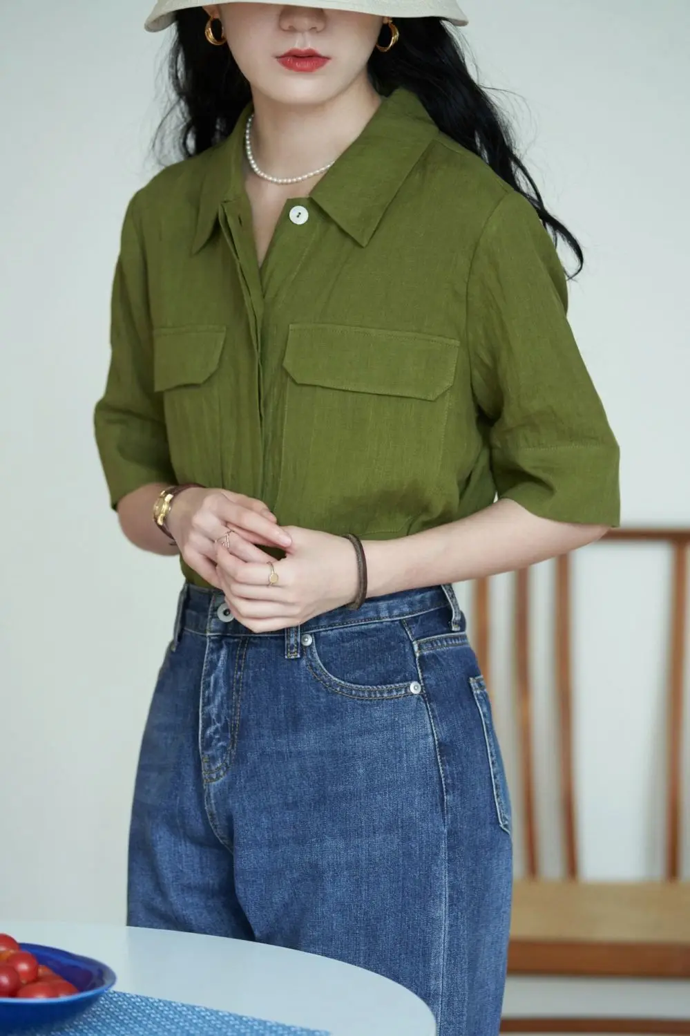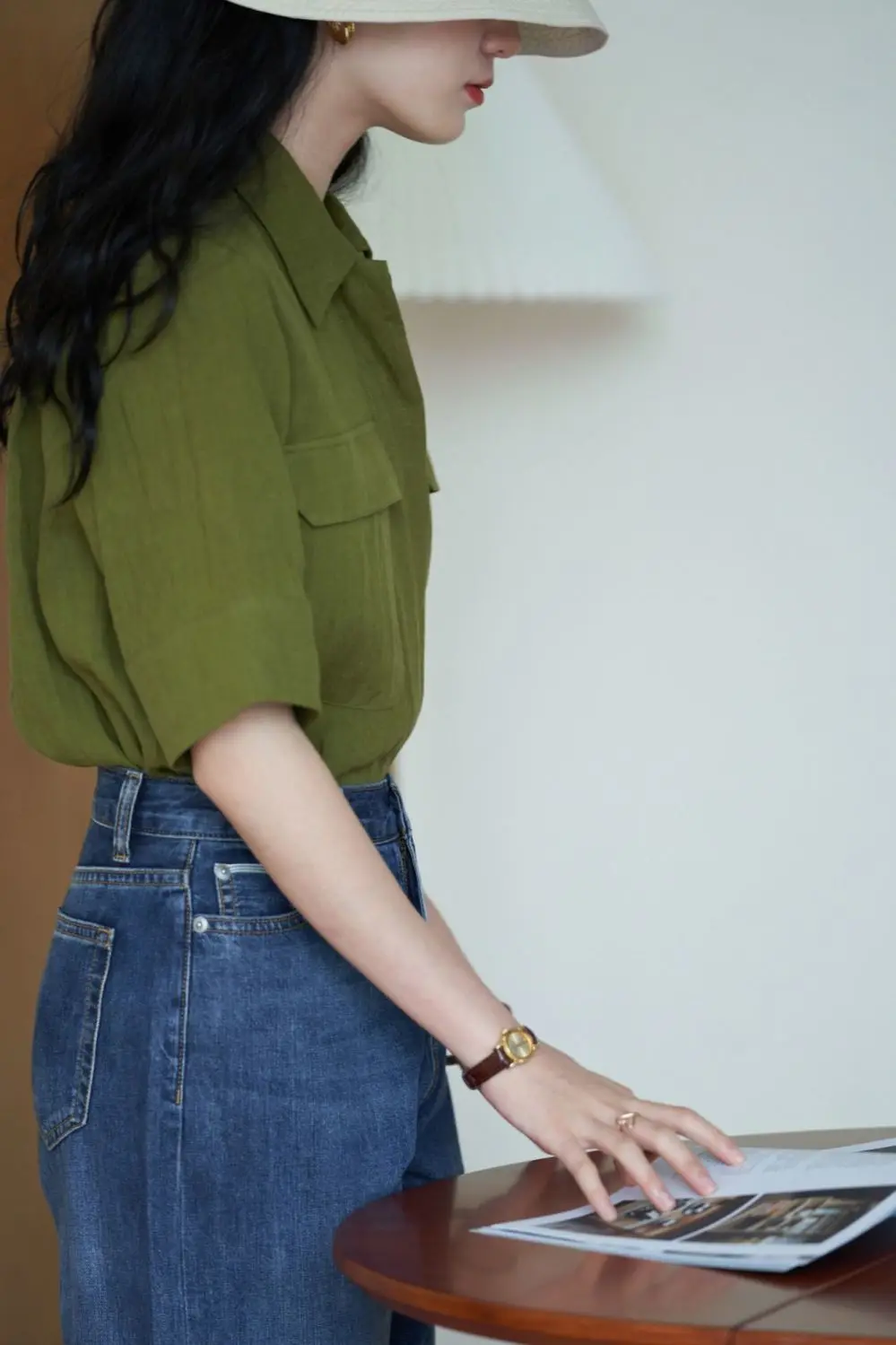 Yipinpay 2023 Summer Casual Short Sleeve Chiffon Shirt Women Vintage Pocket Button Ladies Ladies Blouse Female Clothing Tops