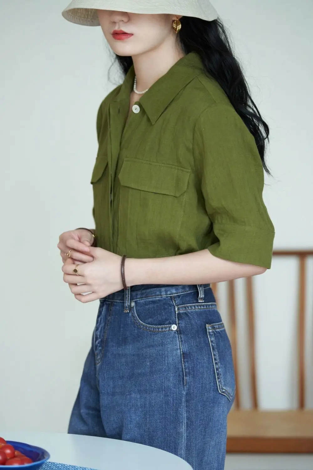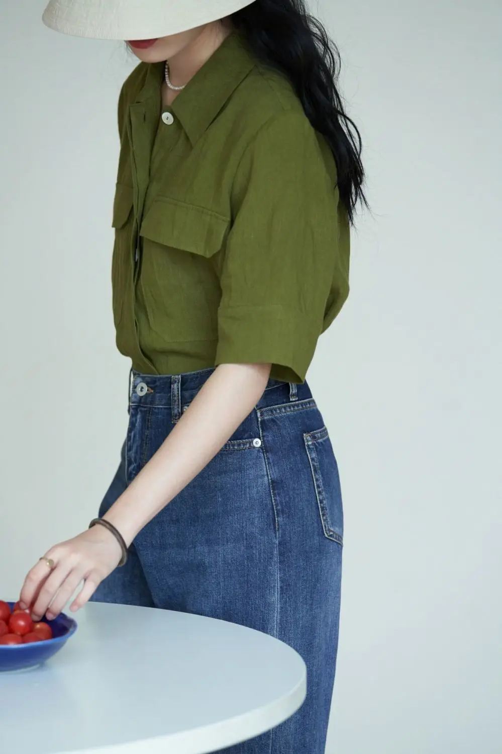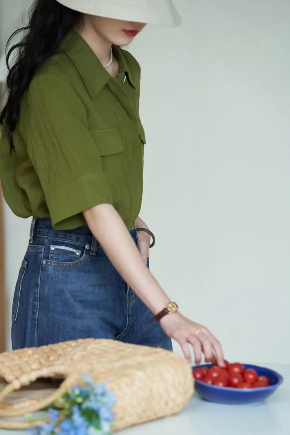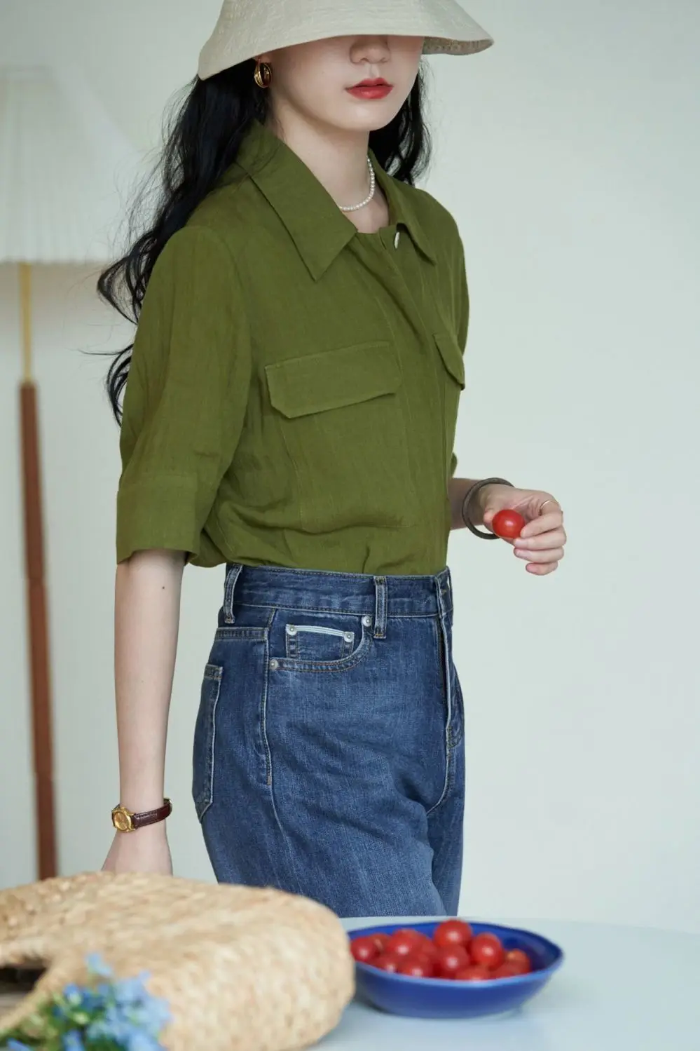 Yipinpay 2023 Summer Casual Short Sleeve Chiffon Shirt Women Vintage Pocket Button Ladies Ladies Blouse Female Clothing Tops