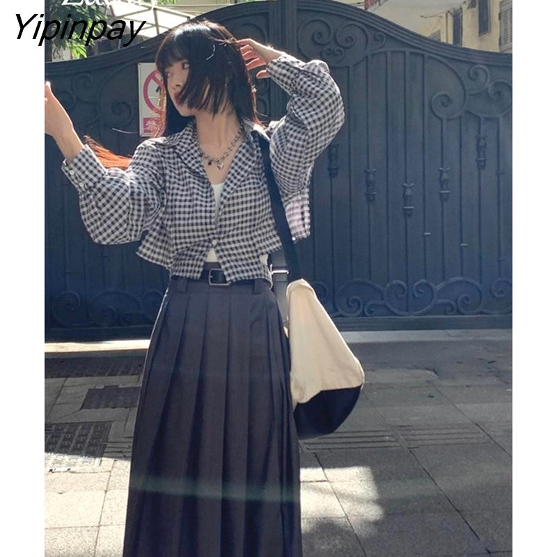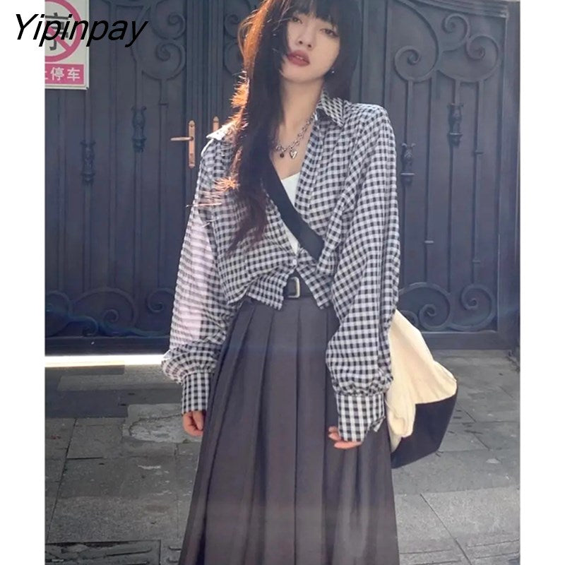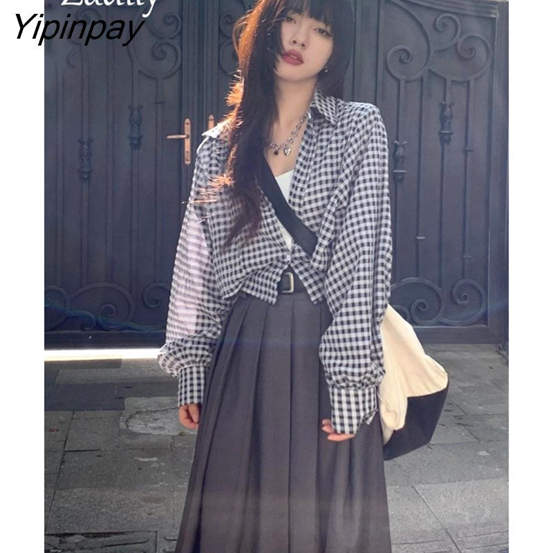 Yipinpay 2023 Summer Long Sleeve Plaid Chiffon Shirt Women Korean style Button Up Ladies Crop Tops Causal Female Clothing Blouse