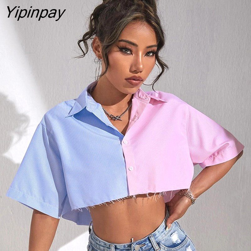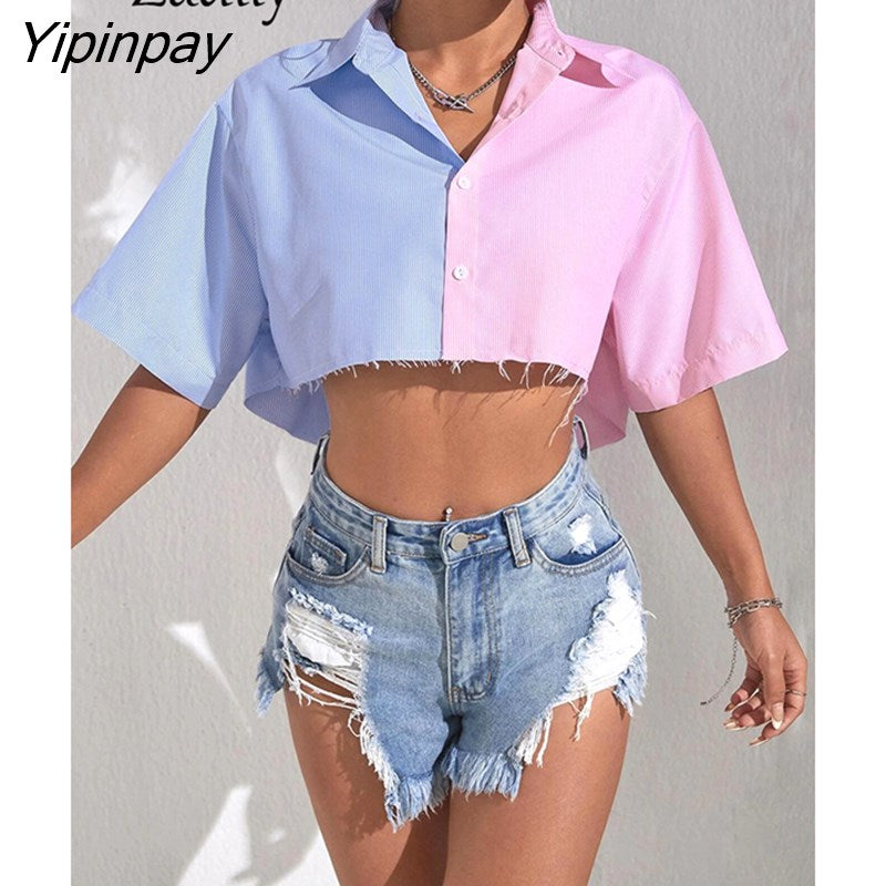 Yipinpay 2023 Summer New Streetwear Short Sleeve Women Shirt Y2K Patchwork Button Up Woman Crop Tops Blouse Party Female Clothing