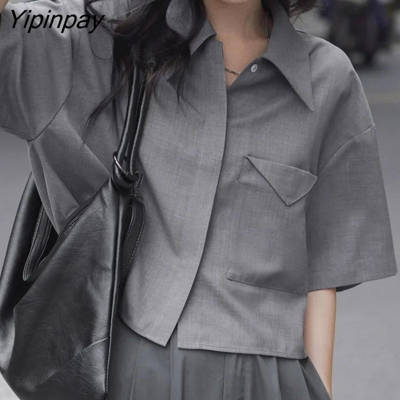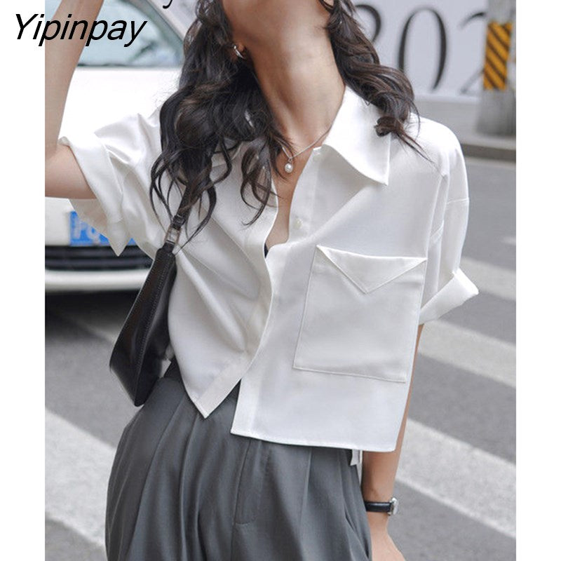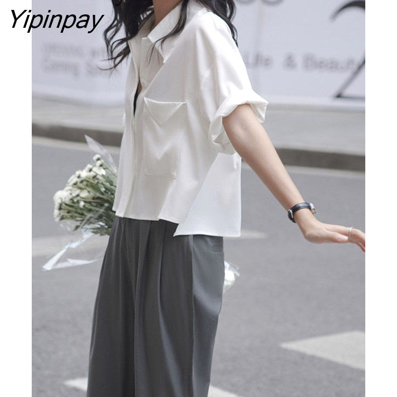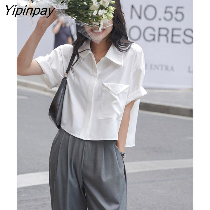 Yipinpay 2023 Summer Short Sleeve Pocket White Shirt Women Minimalist Style Button Up Crop Tops Blouse Casual Female Clothing