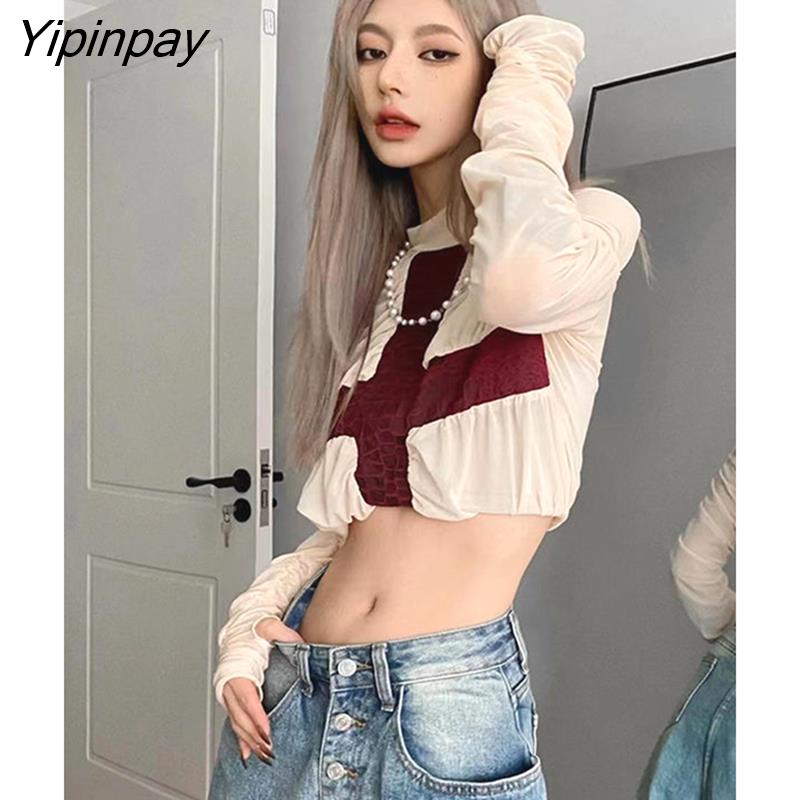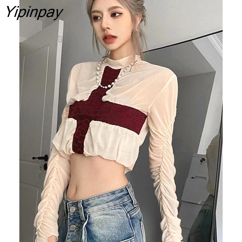 Yipinpay 2023 Summer Street Style Long Sleeve cross Appliques Women Short Blouse Sexy Ladies Chiffon Crop Top Club Female Clothing