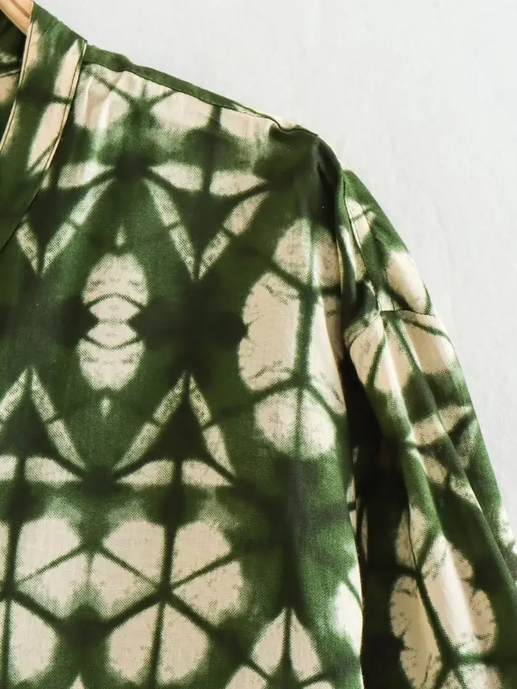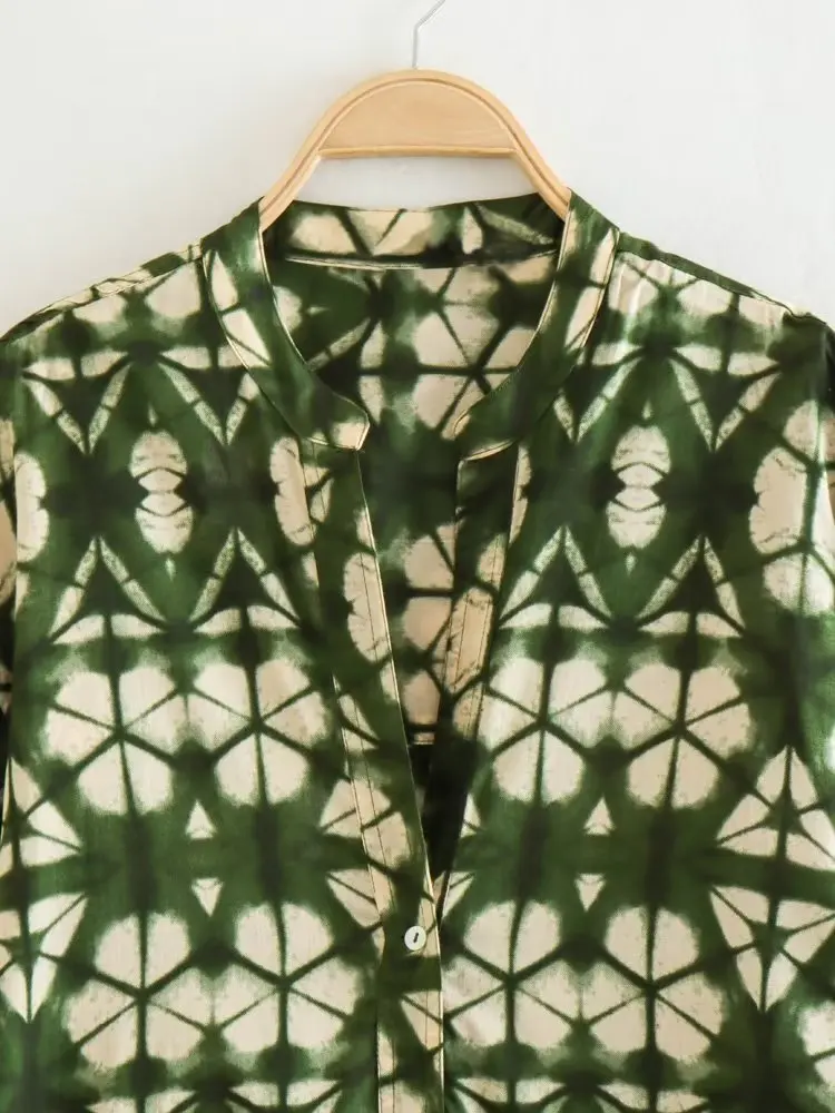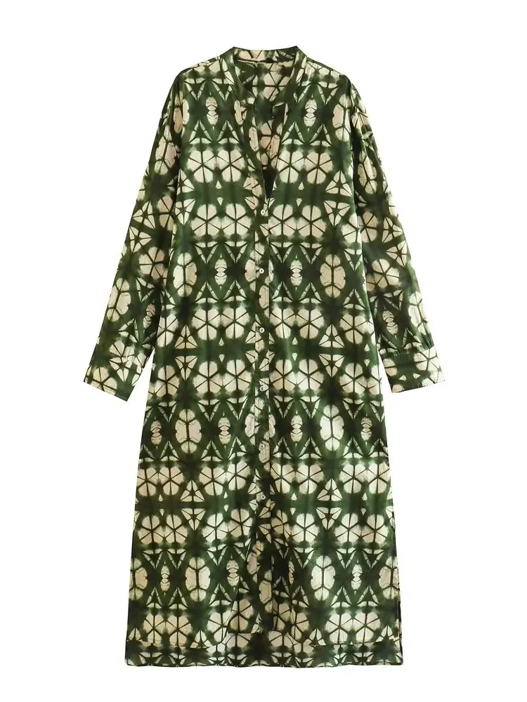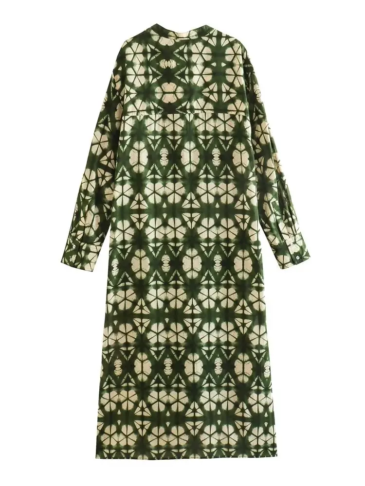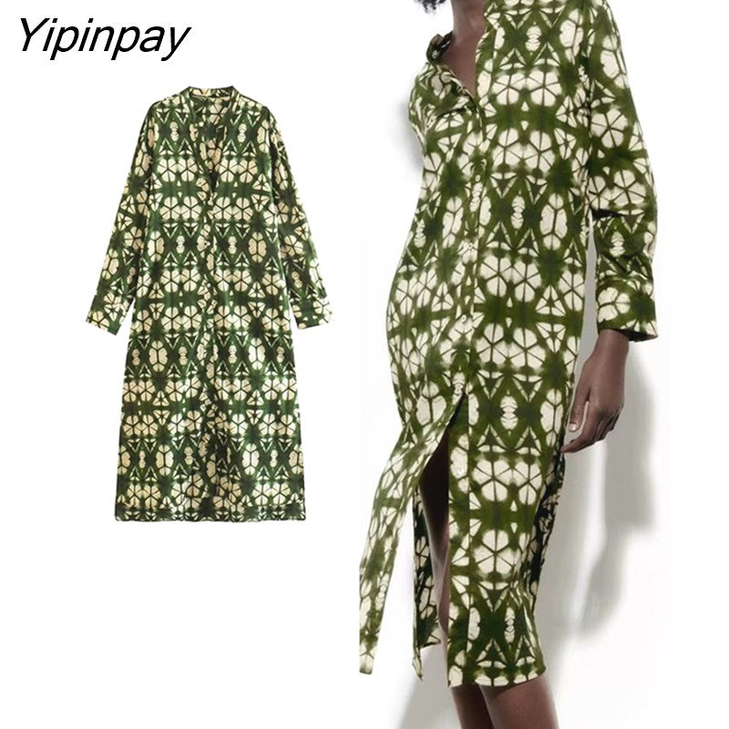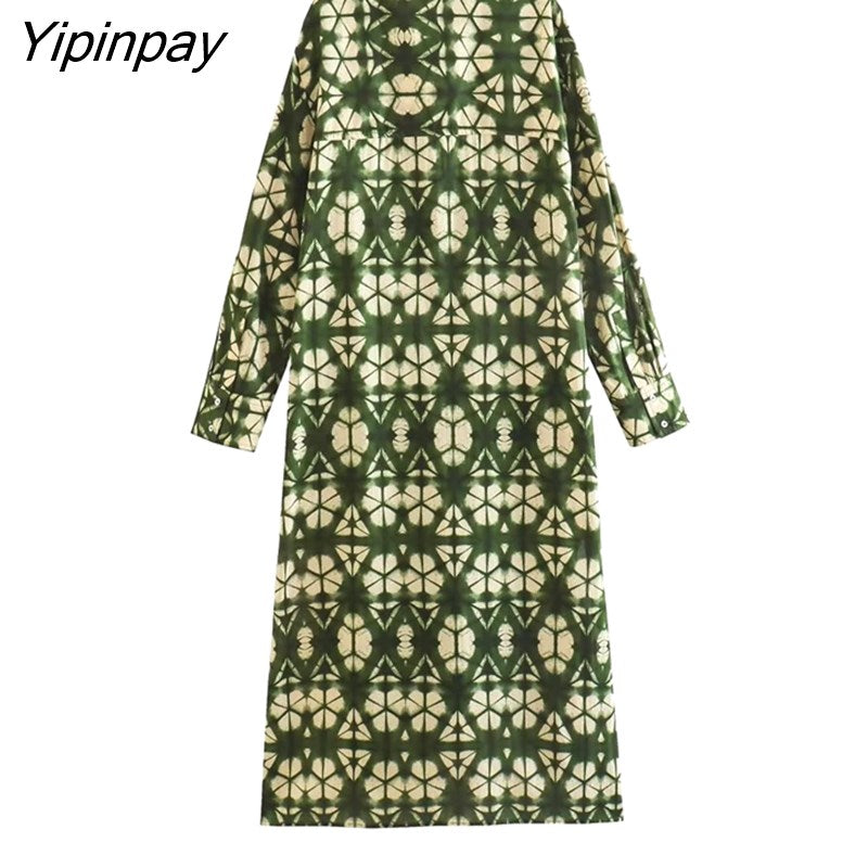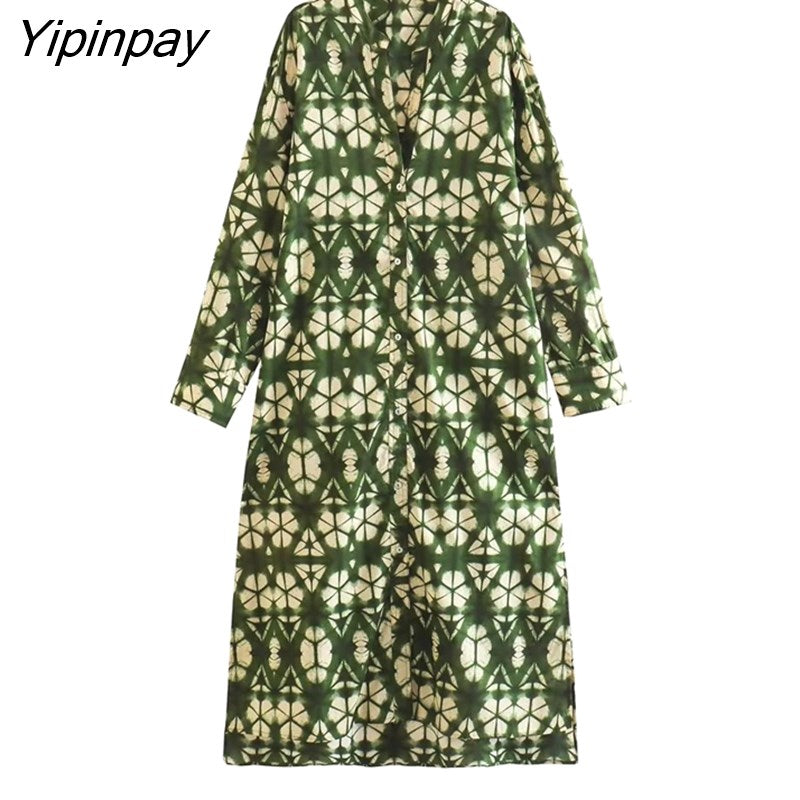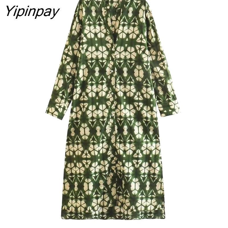 Yipinpay 2023 Summer Women Printed Shirt Dresses Elegant O-neck Single Breasted Dress A-line Long Sleeve Mid-Calf Vestidos