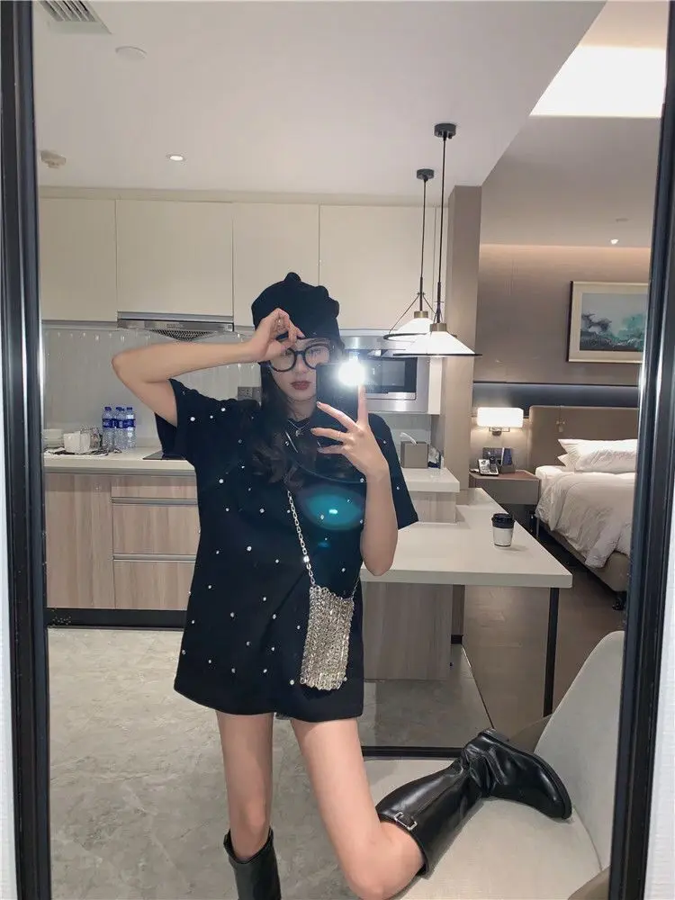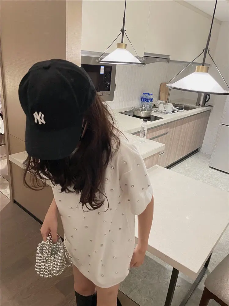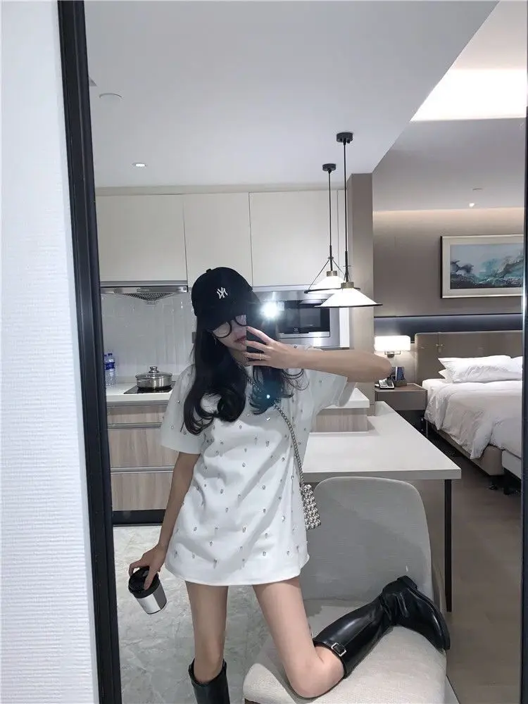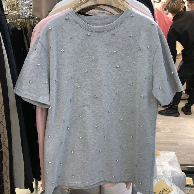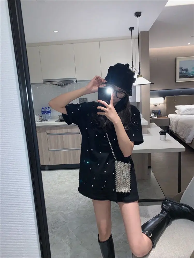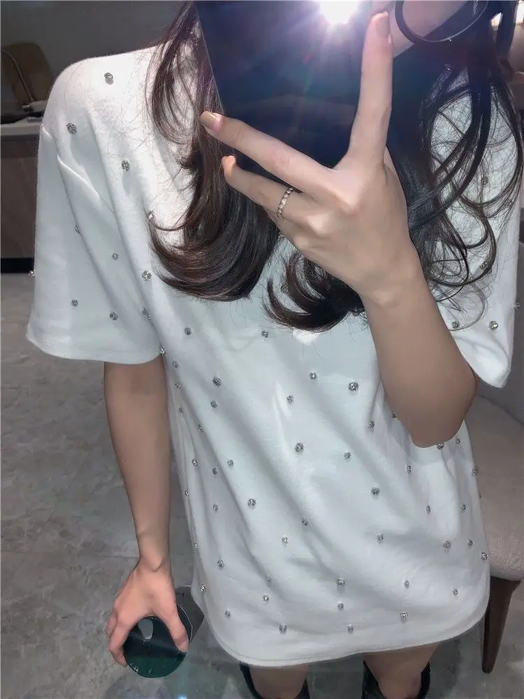 Yipinpay 2023 Summer Women T-shirt Casual Loose Diamond Cotton Half Sleeve Tshirt Big Female Basic Tops Tees Heavy Industry 4XL