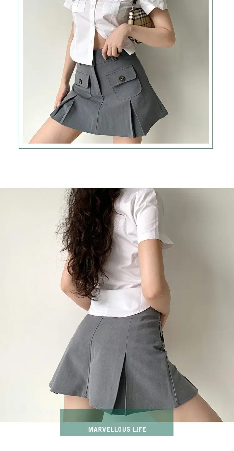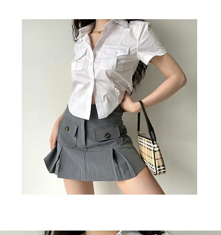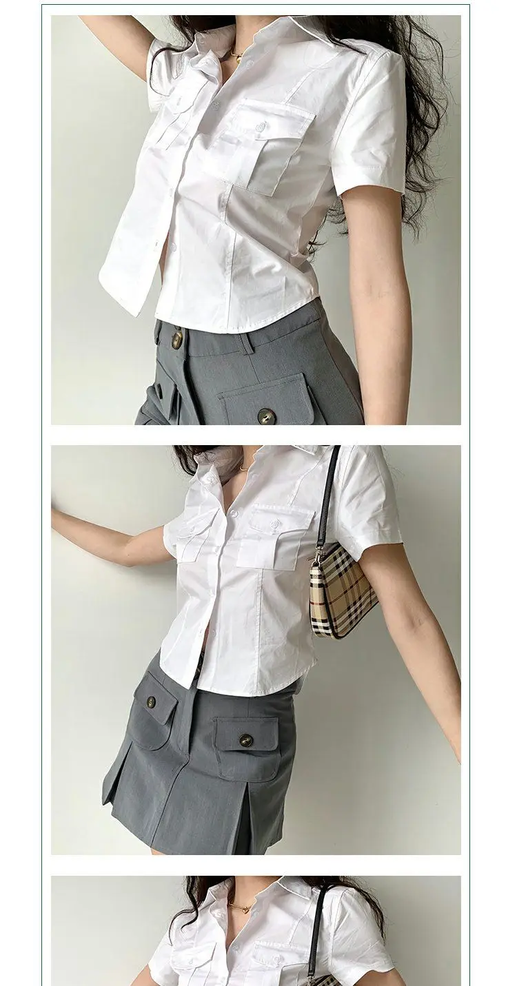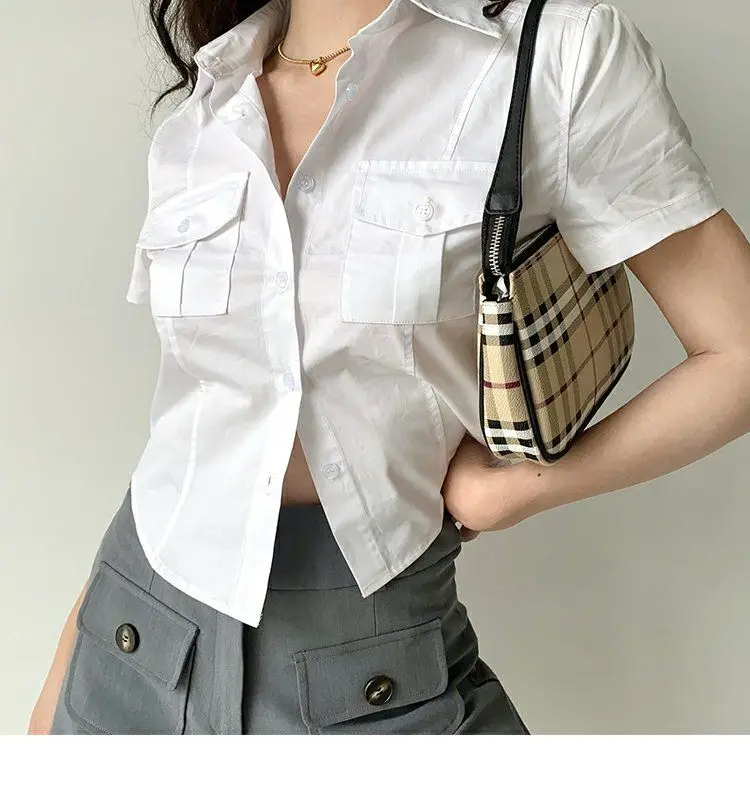 Yipinpay 2023 Summer Y2K Pocket Short Sleeve White Shirt Women Sexy Button Slim Crop Tops Blouse New Streetwear Female Clothing