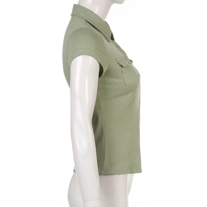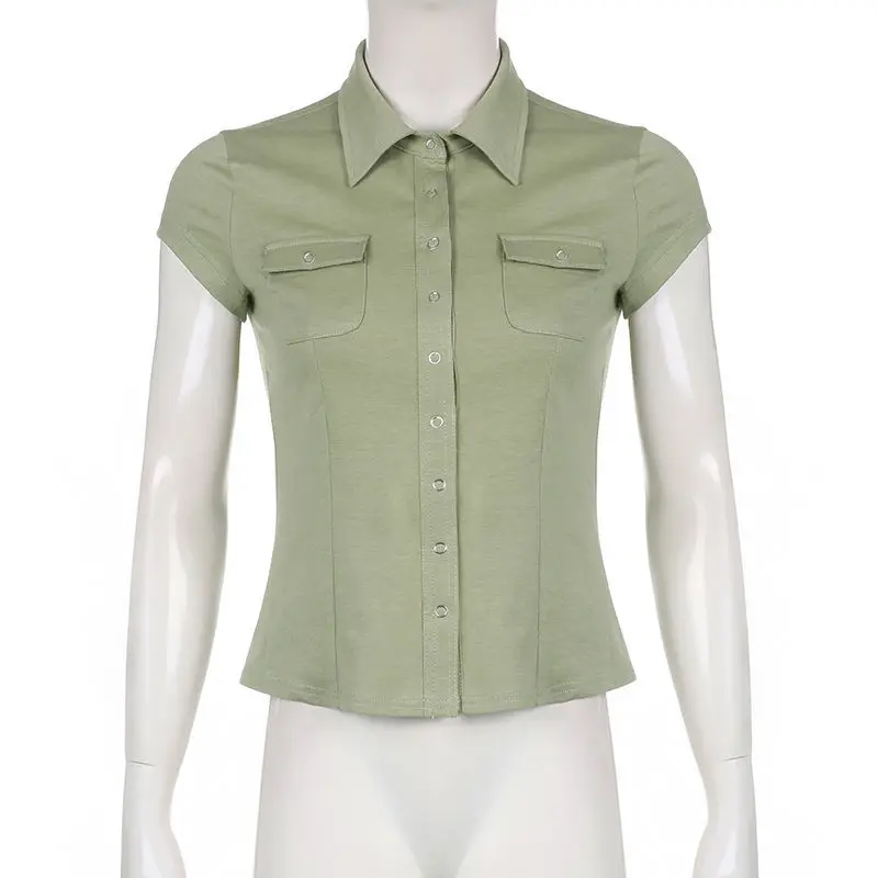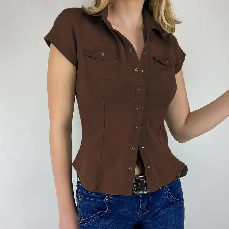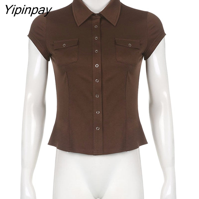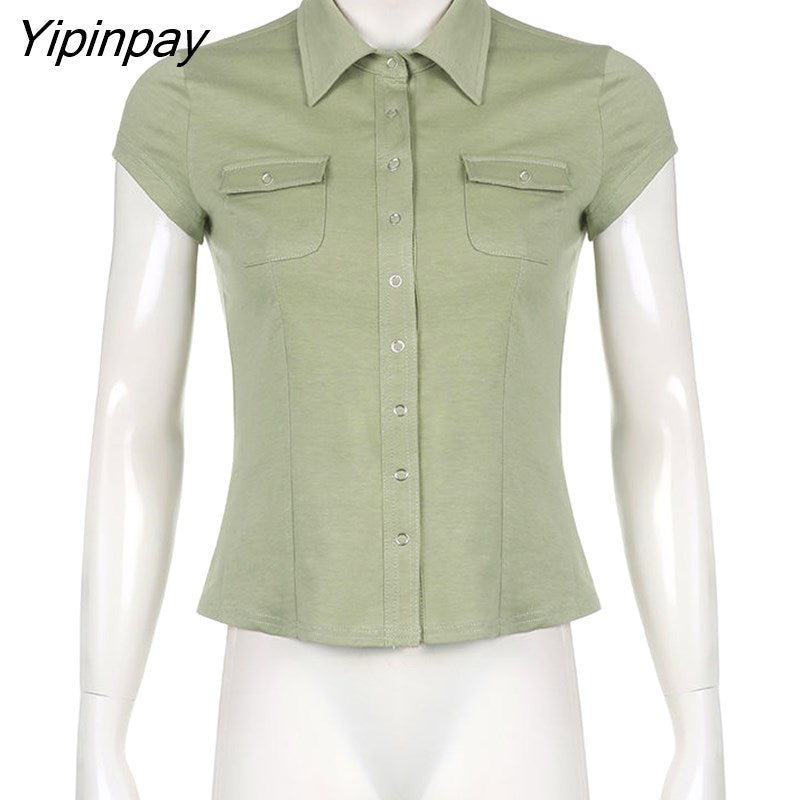 Yipinpay 2023 Summer Y2K Short Sleeve CowBoy Shirt Women Safari Style Button Up Pocket Slim Ladies Tops Female Clothing Blouse