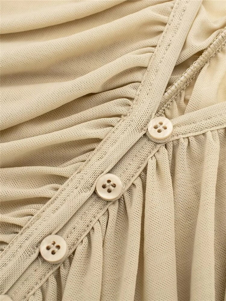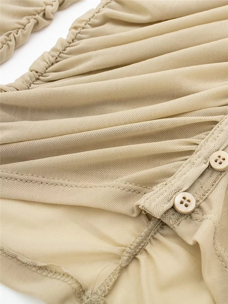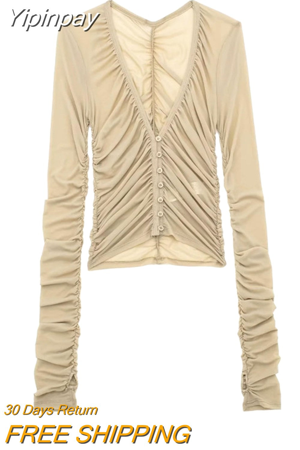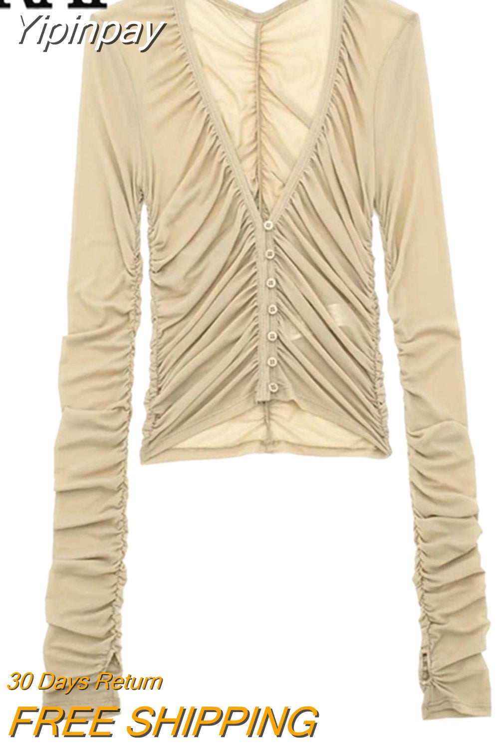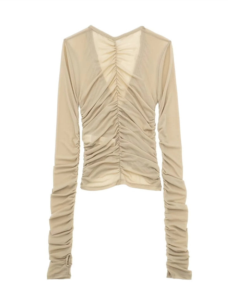 Yipinpay 2023 Tulle Crop Top Women Ruched Mesh Top Female Cropped Sexy See Through Tops Woman Long Sleeve Semi Transparent Blouse