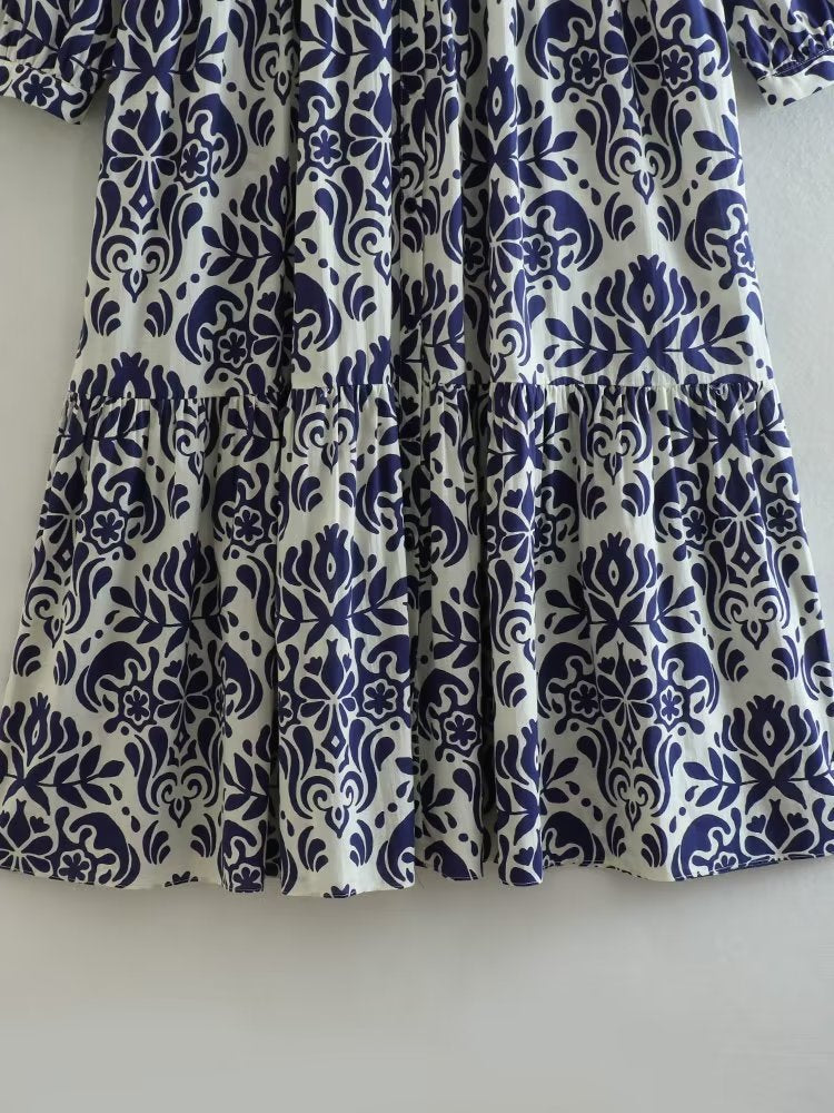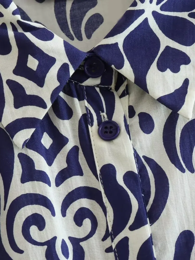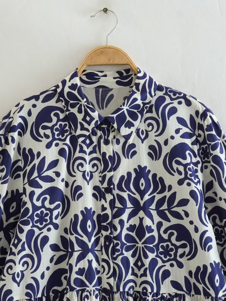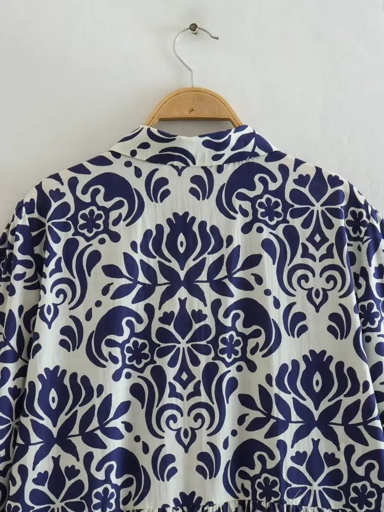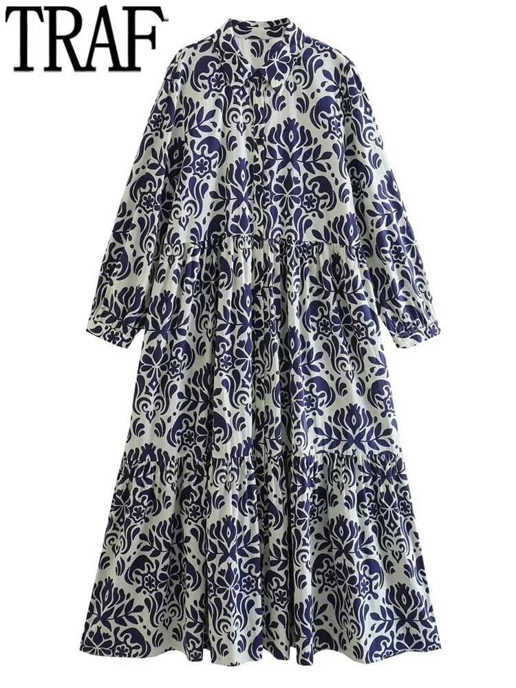 Yipinpay 2023 Vintage Print Long Dress Women Blue Shirt Dress Woman Ruffle Long Sleeve Midi Dresses Women's Elegant Loose Dresses