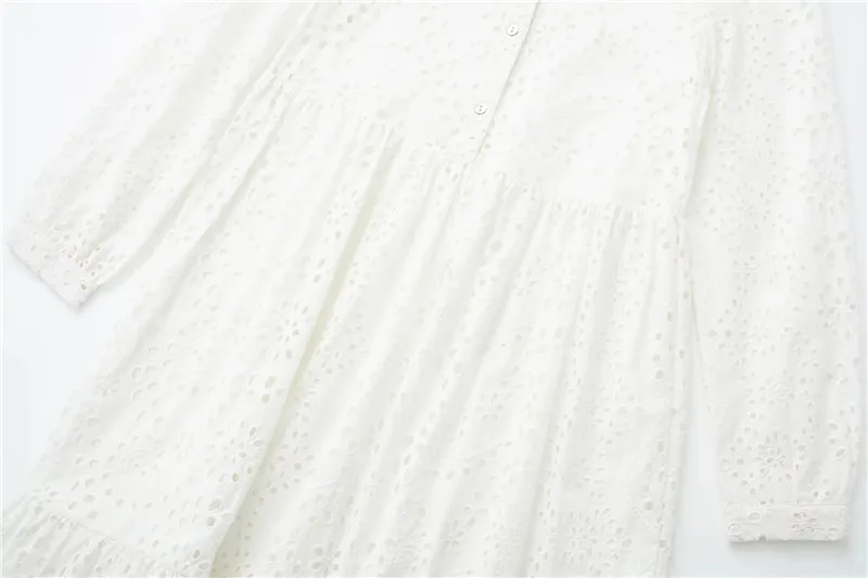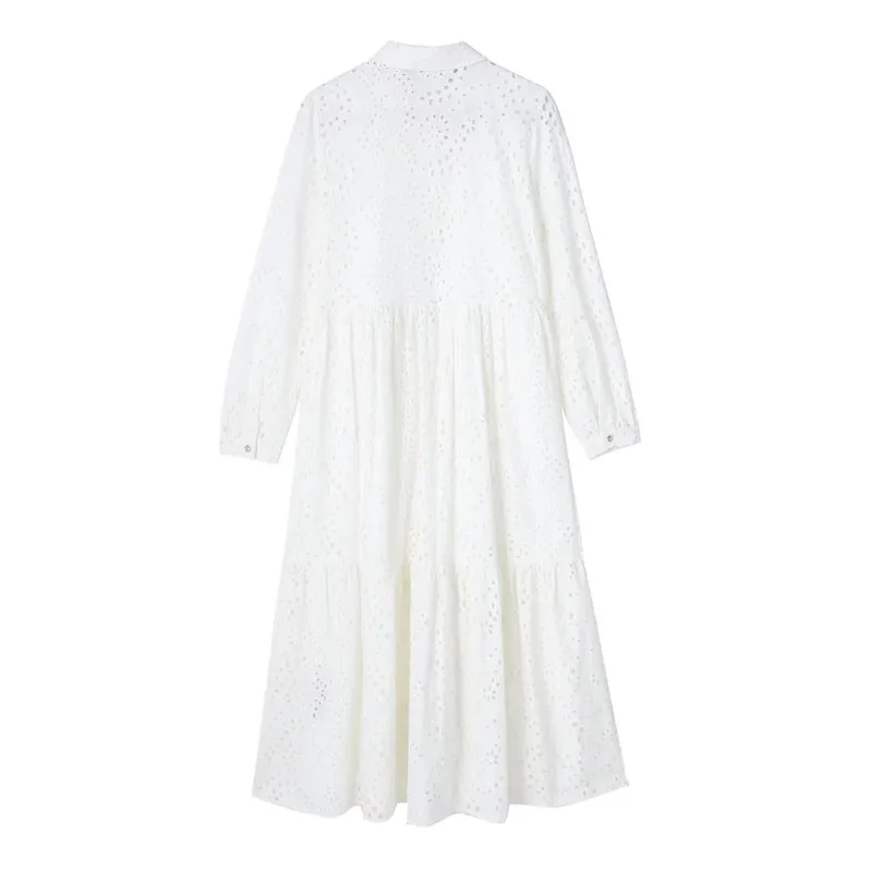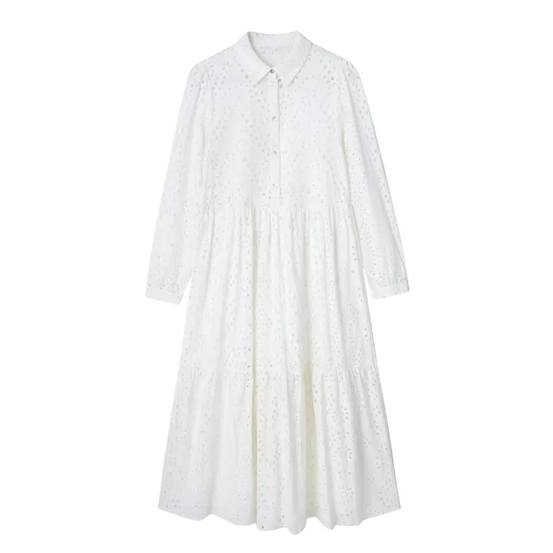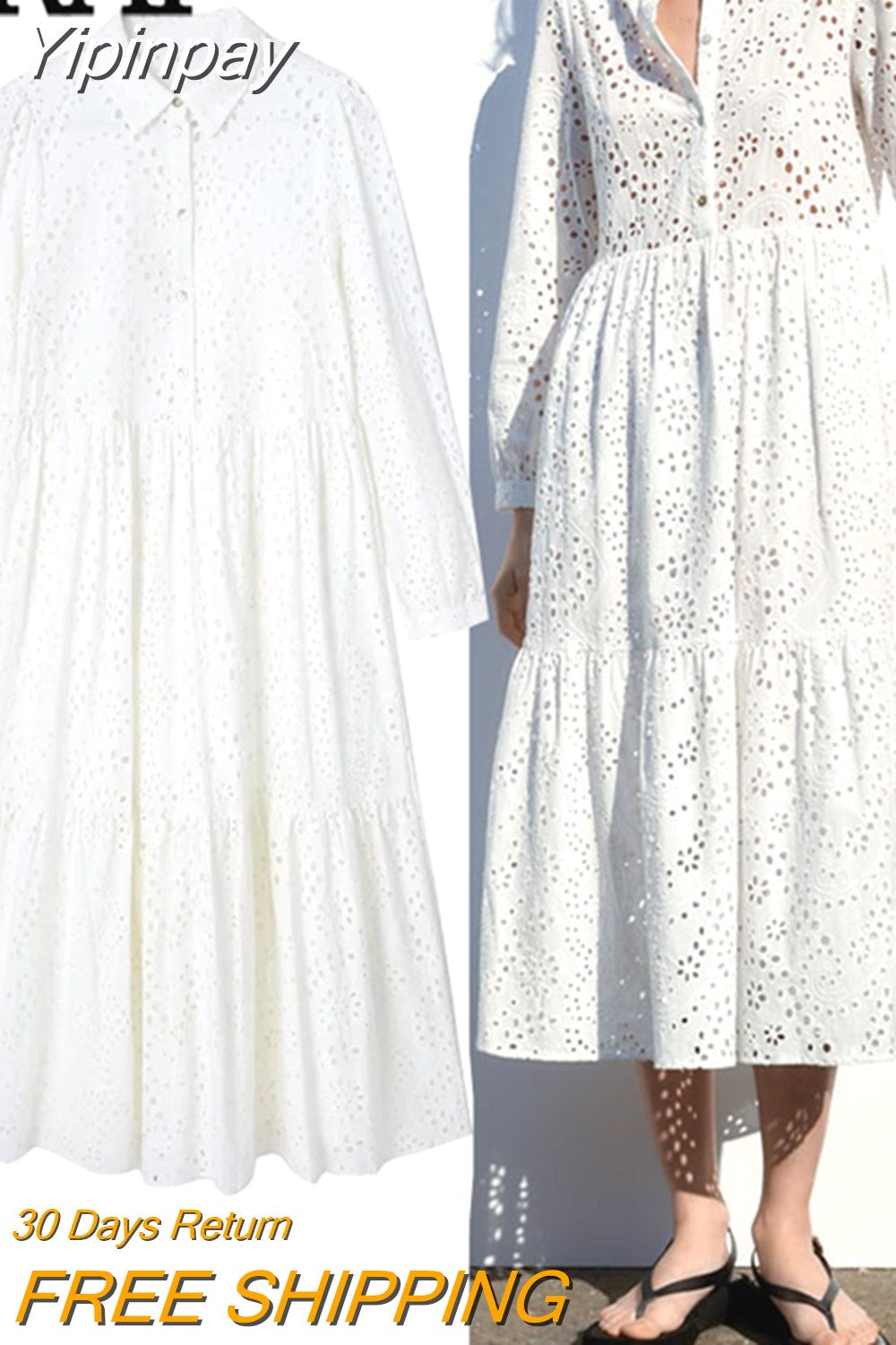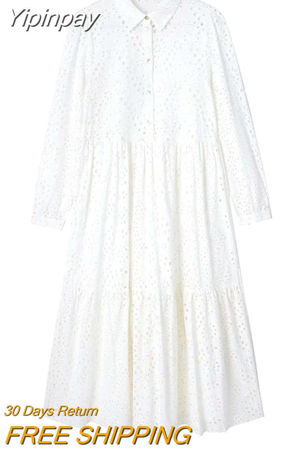 Yipinpay 2023 White Long Dress Women Cut Out Embroidery Shirt Dress Woman Long Sleeve Midi Dresses Women's Elegant Loose Dresses