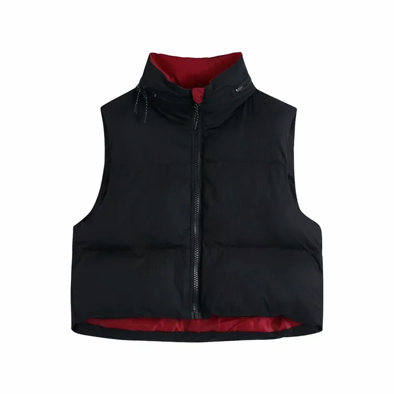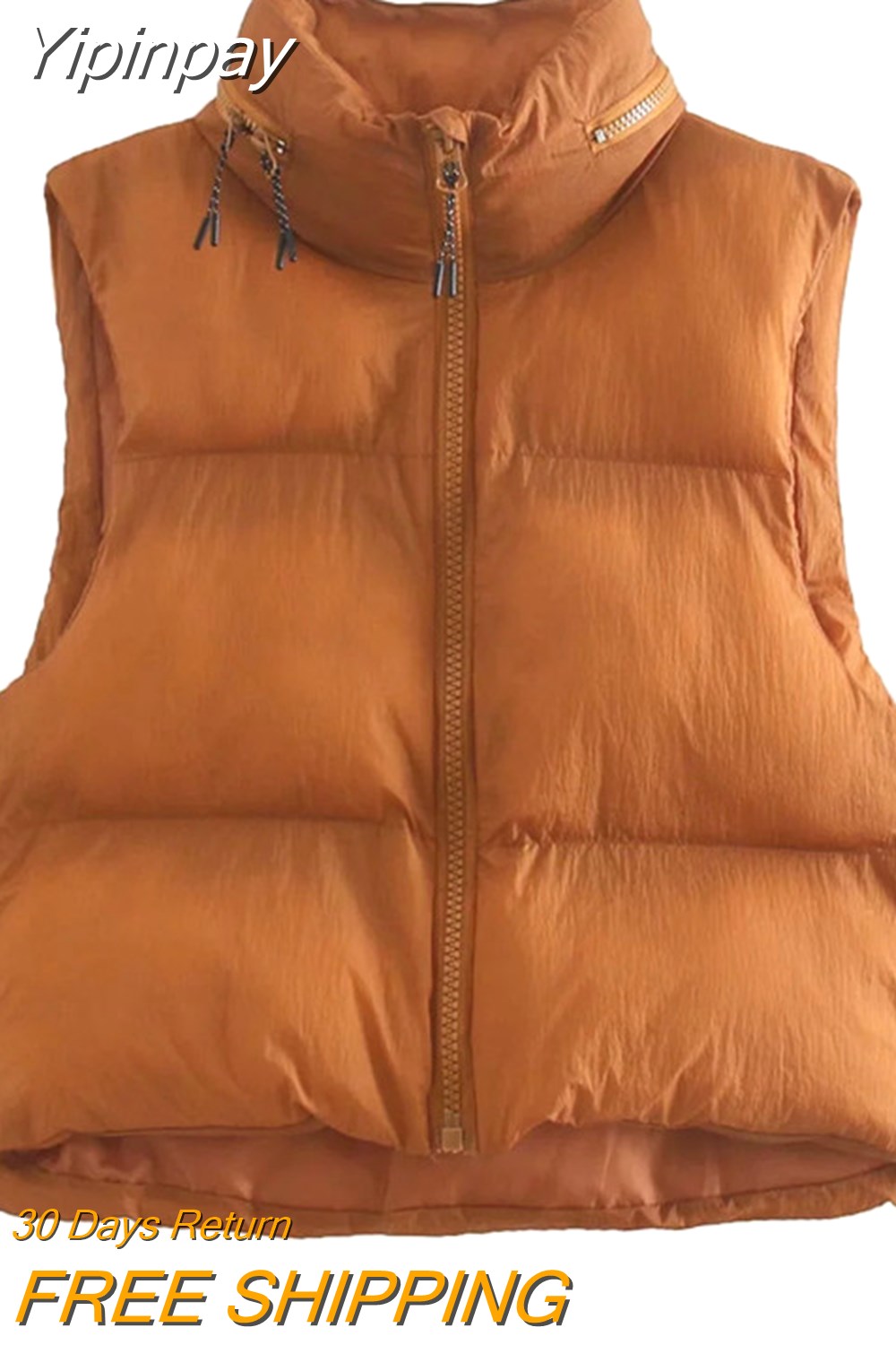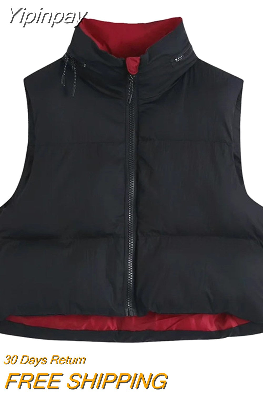 Yipinpay 2023 Winter Black Cropped Vest Coat Women Fashion Keep Warm Sleeveless High Collar Zip Up Wasitcoats Woman Casual Vest Top
