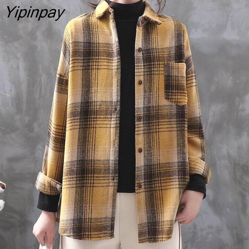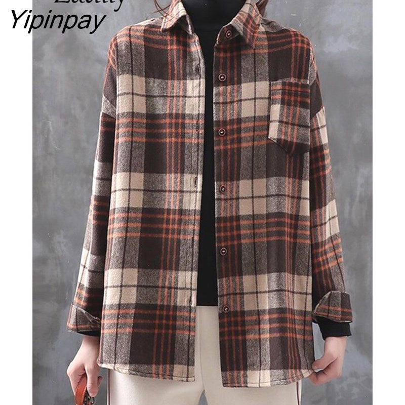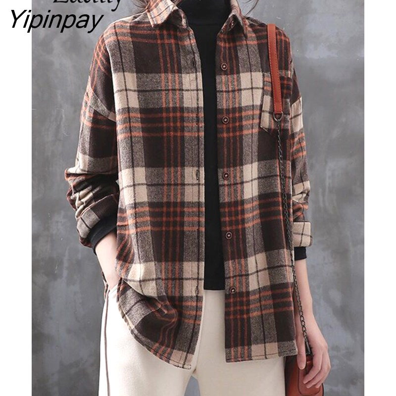 Yipinpay 2023 Winter Korean Style Long Sleeve Loose Plaid Shirt Women Causal Button Up Tunic Blouse Female Tops Clothing