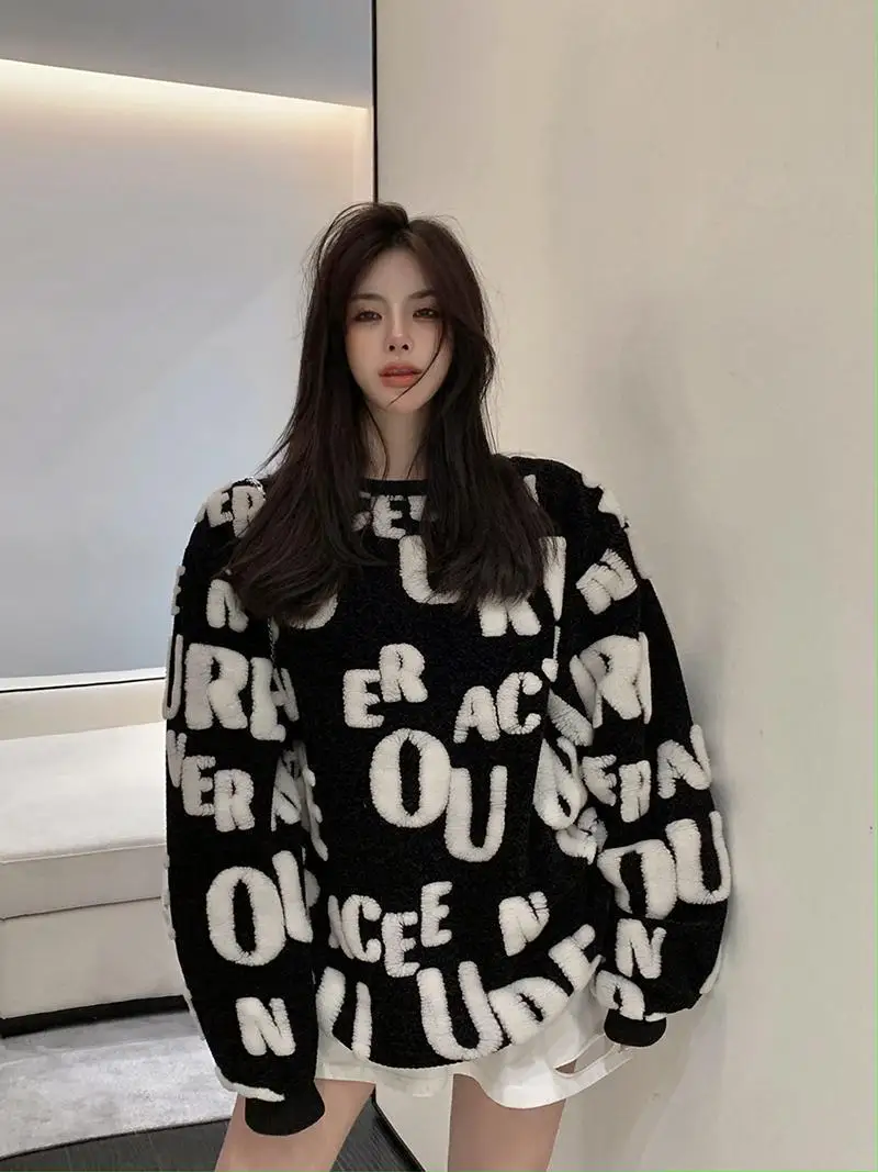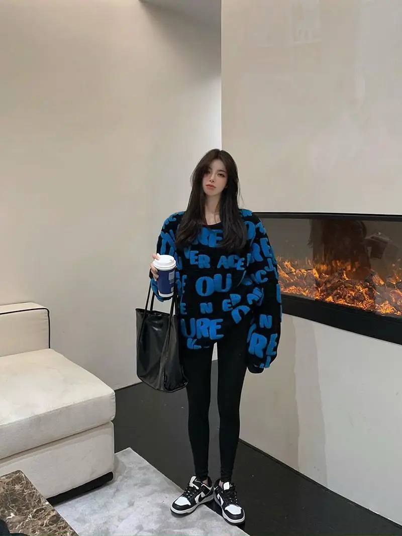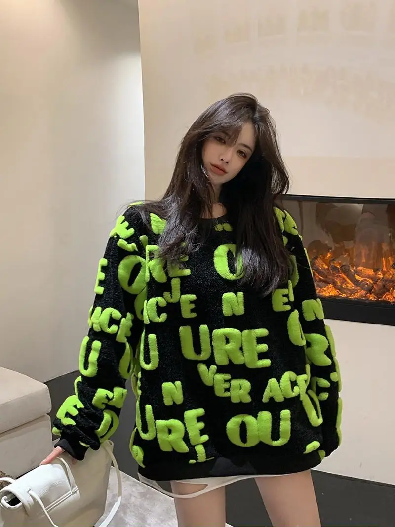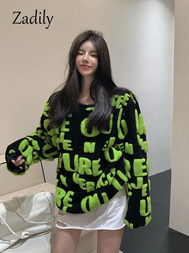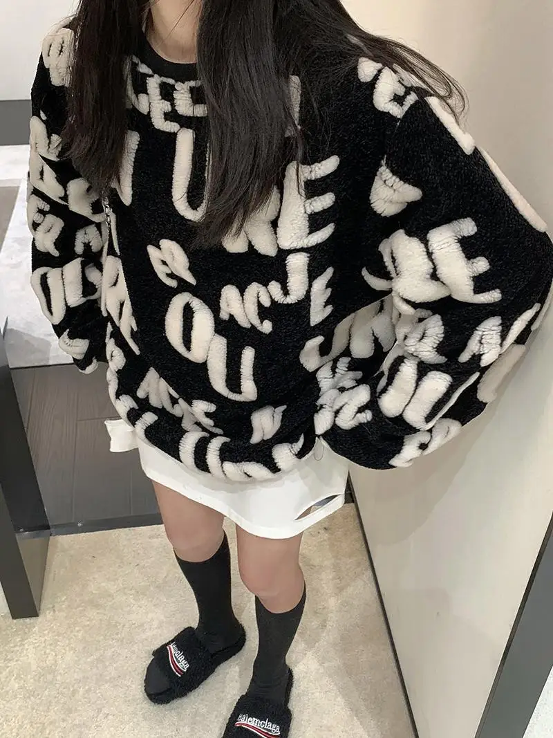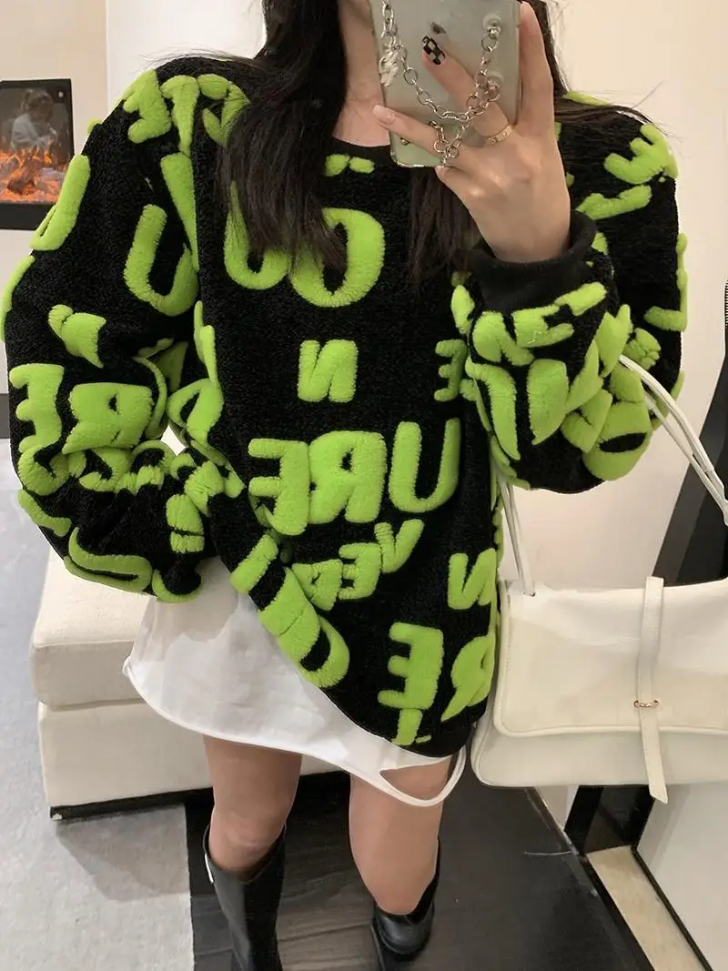 Yipinpay 2023 Winter Oversize Long Sleeve Women Sweater Streetwear O Neck Letter Embroidery Knit Ladies Pullover Female Clothing