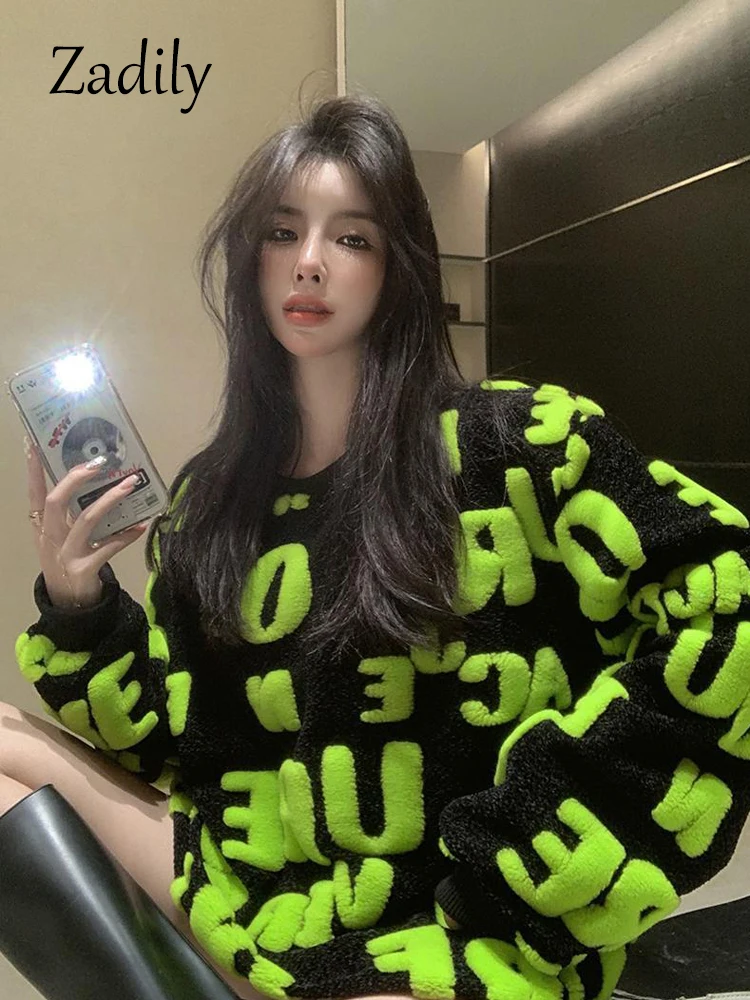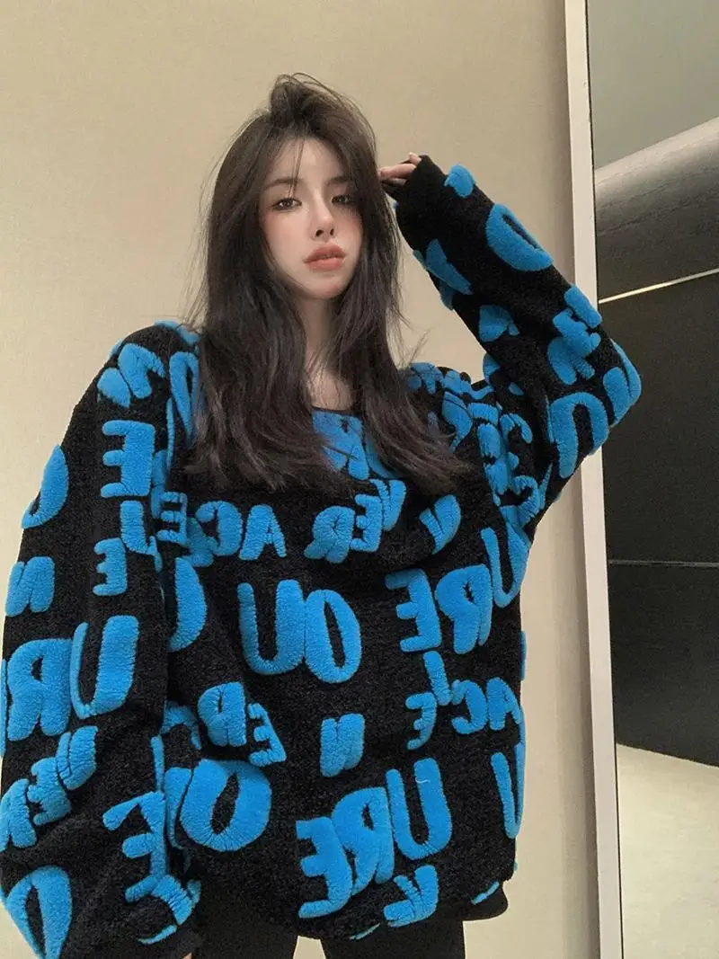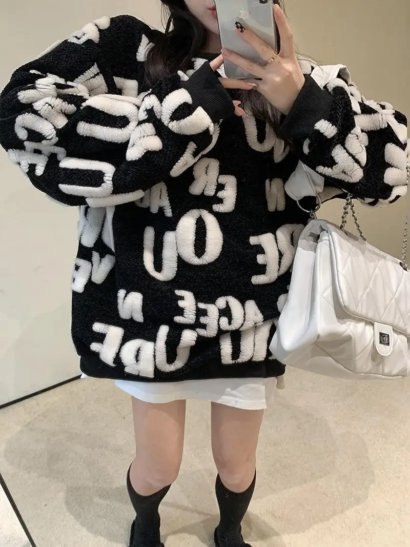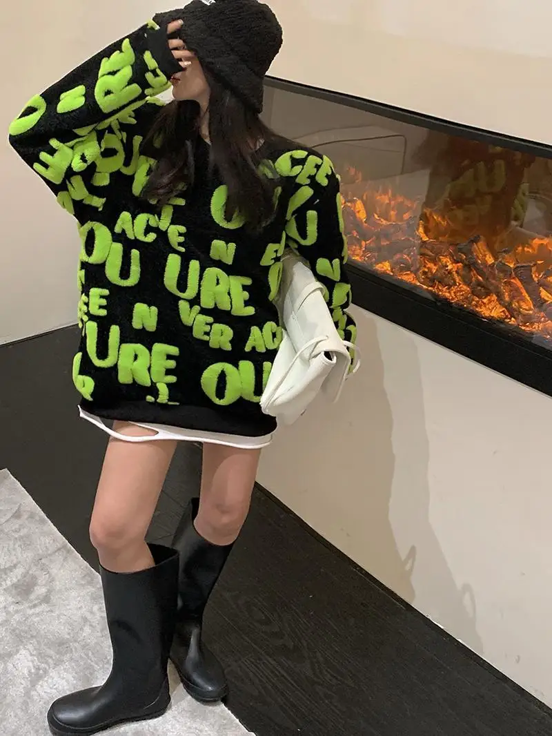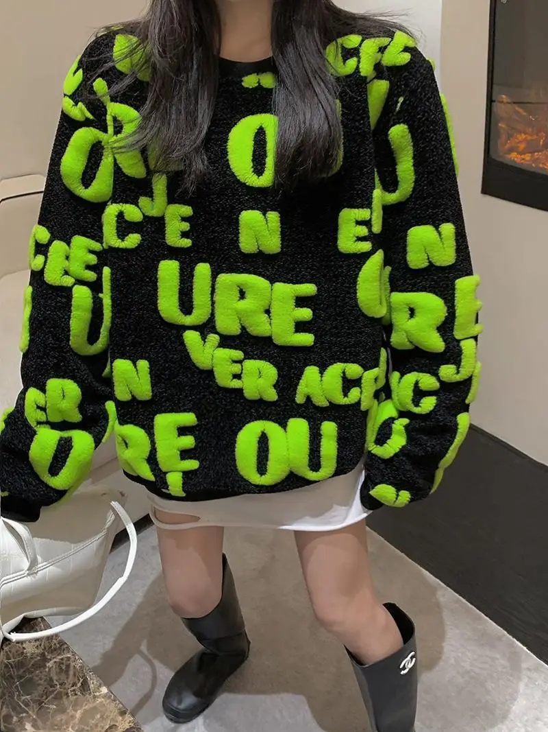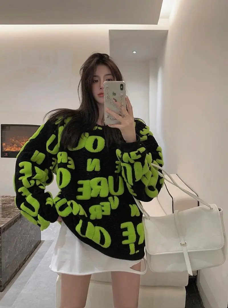Yipinpay 2023 Winter Oversize Long Sleeve Women Sweater Streetwear O Neck Letter Embroidery Knit Ladies Pullover Female Clothing