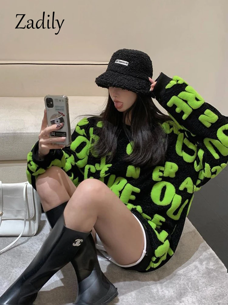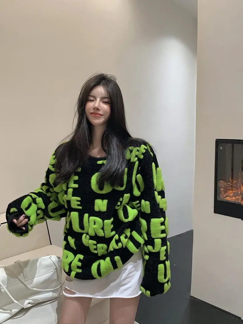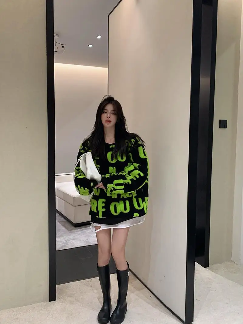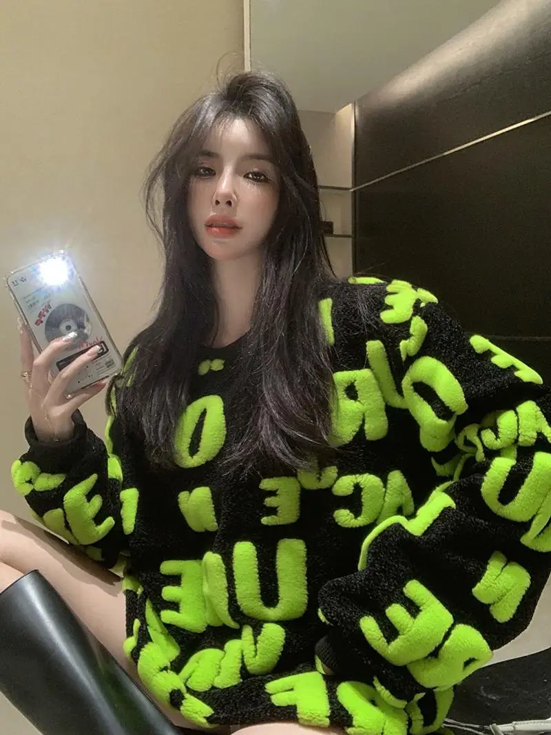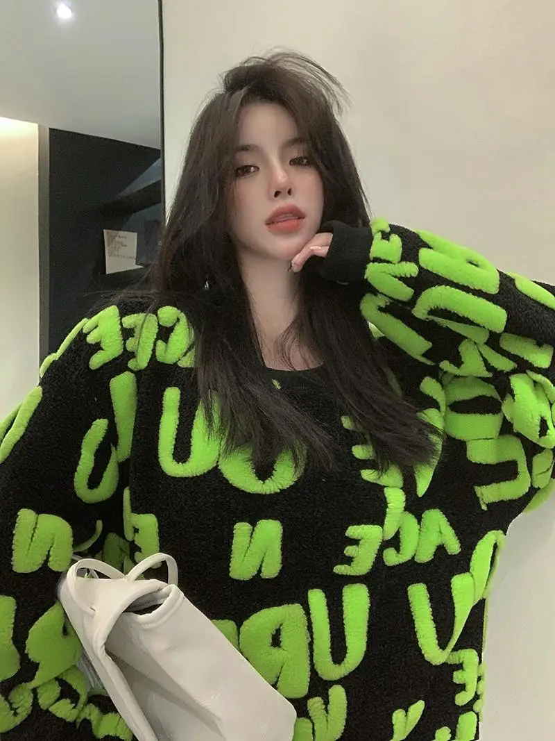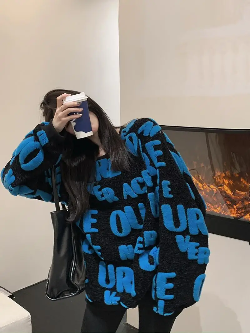 Yipinpay 2023 Winter Oversize Long Sleeve Women Sweater Streetwear O Neck Letter Embroidery Knit Ladies Pullover Female Clothing