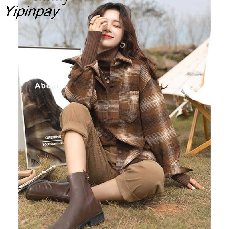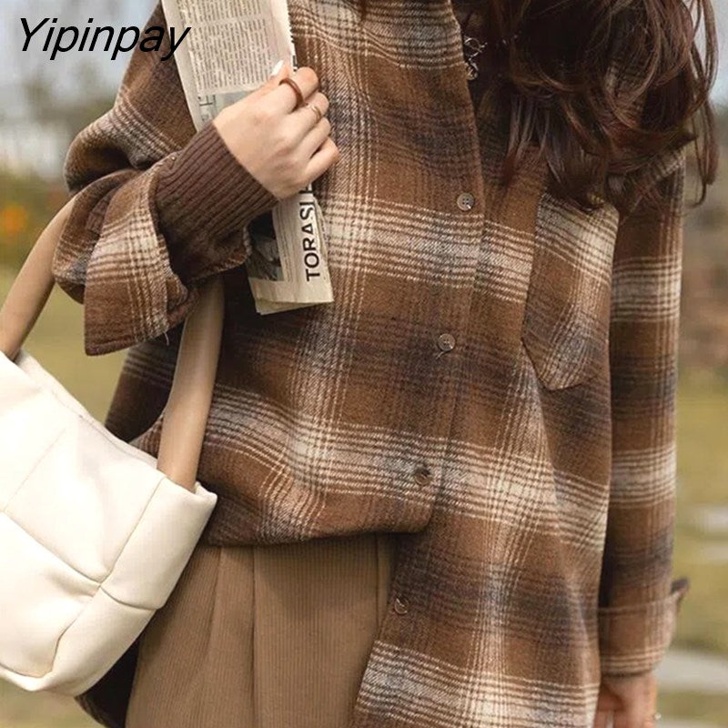 Yipinpay 2023 Winter Vintage Long Sleeve Plaid Women Shirt Korean Style Loose Turn Down Collar Button Up Ladies Tunic Blouse Tops