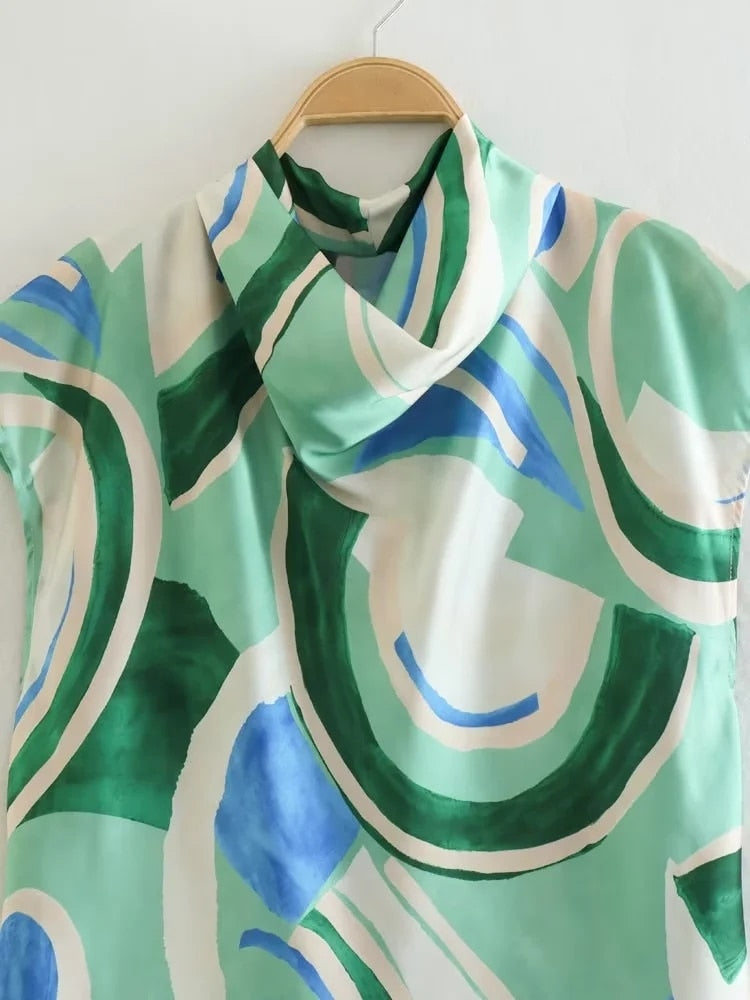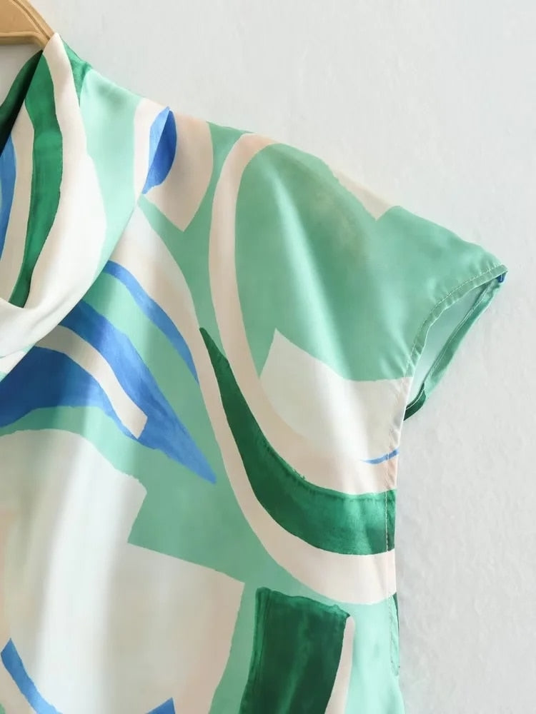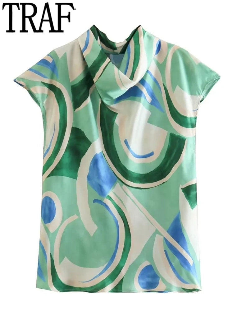 Yipinpay 2023 Woman Blouses Printed Satin Blouse Women Short Sleeve Summer Tops Women High Neck Elegant And Vintage Women's Blouses