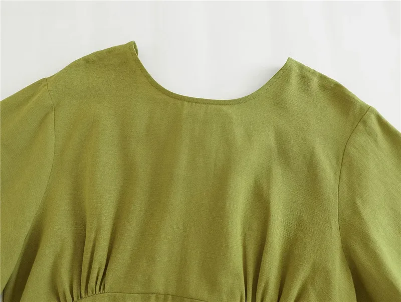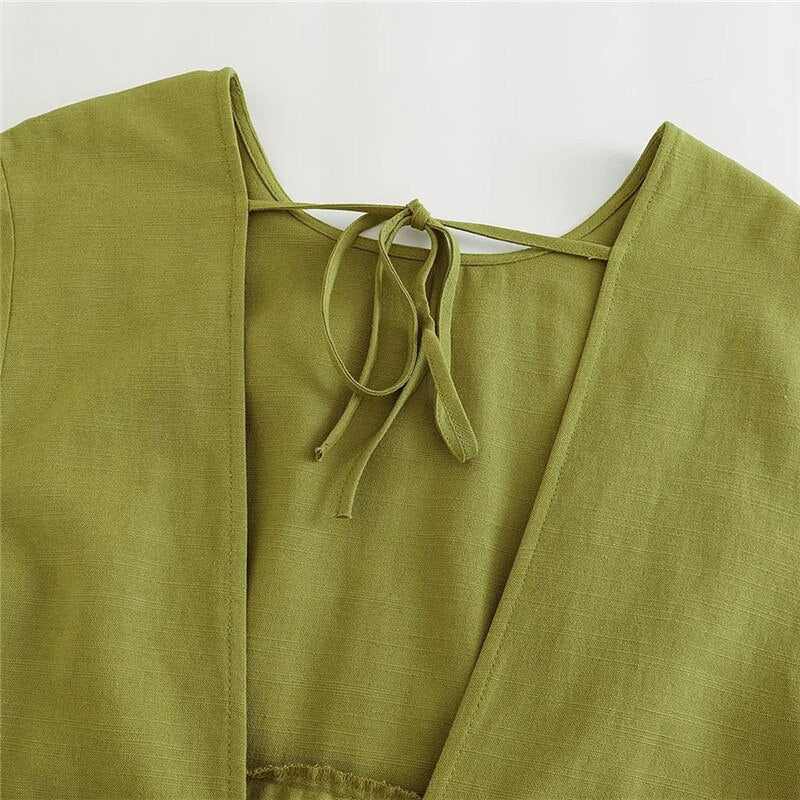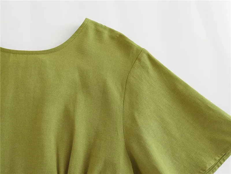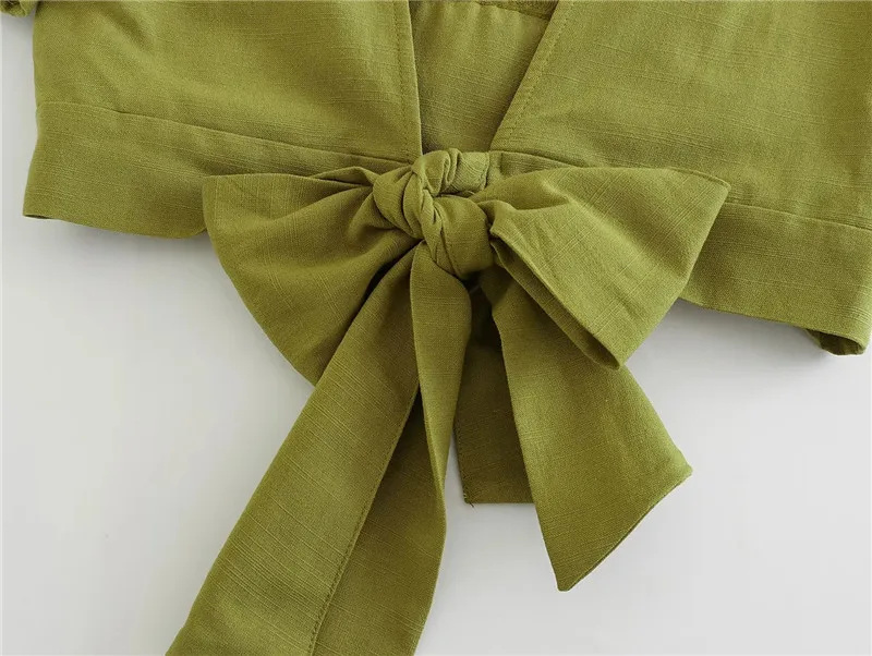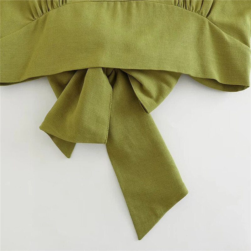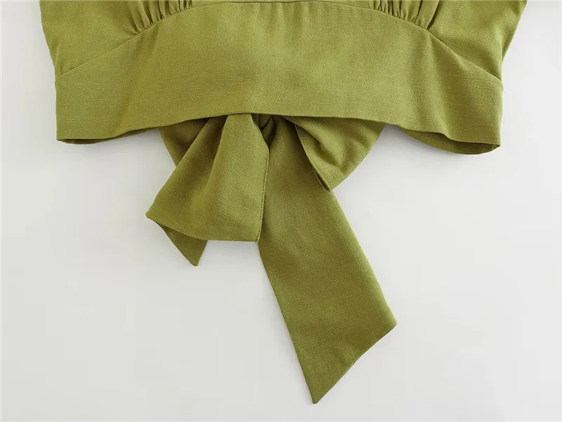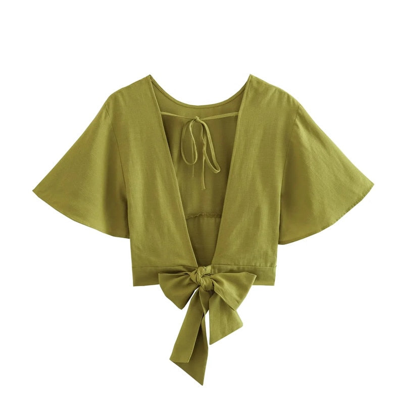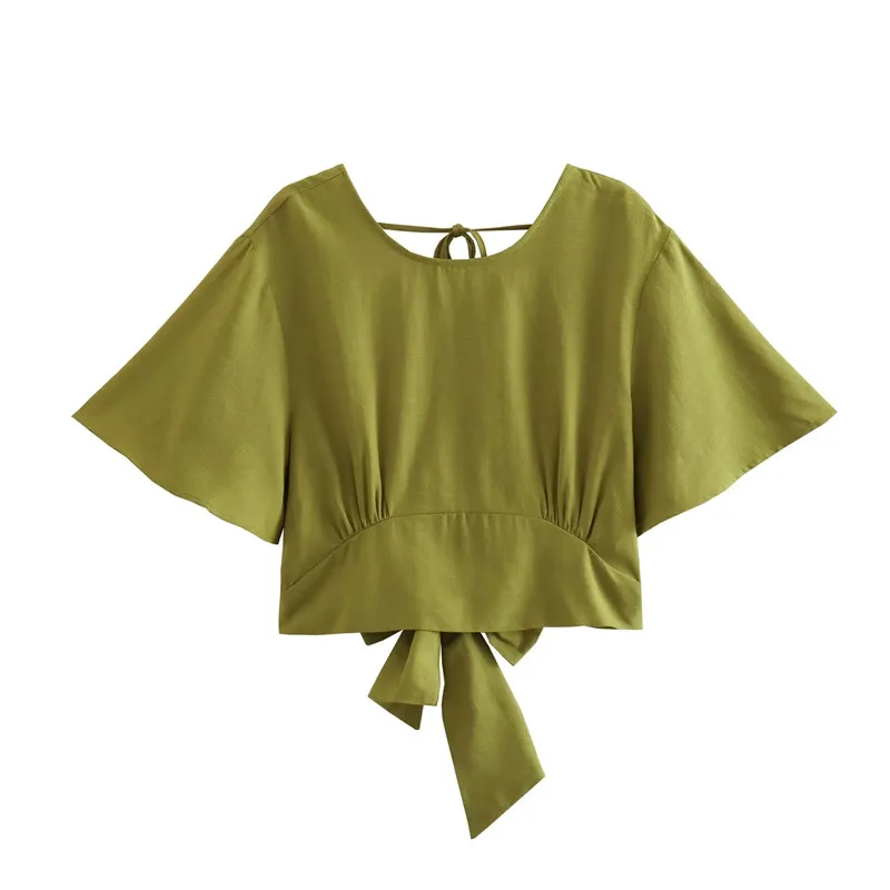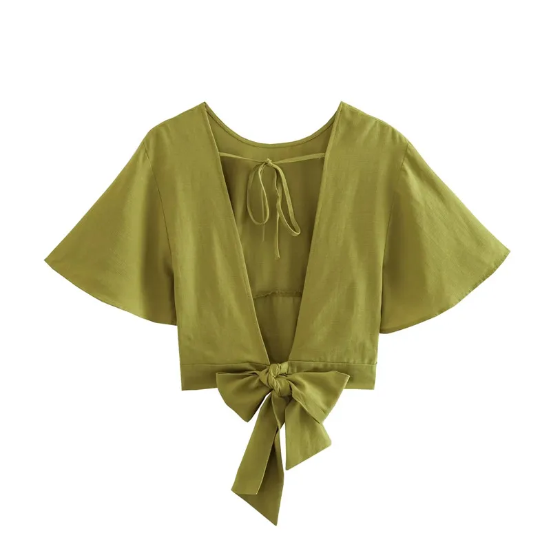 Yipinpay 2023 Woman Bow Backless Crop Top Women Green Short Sleeve Blouses Summer 2023 Tied Streetwear Cropped Chic Women Blouse