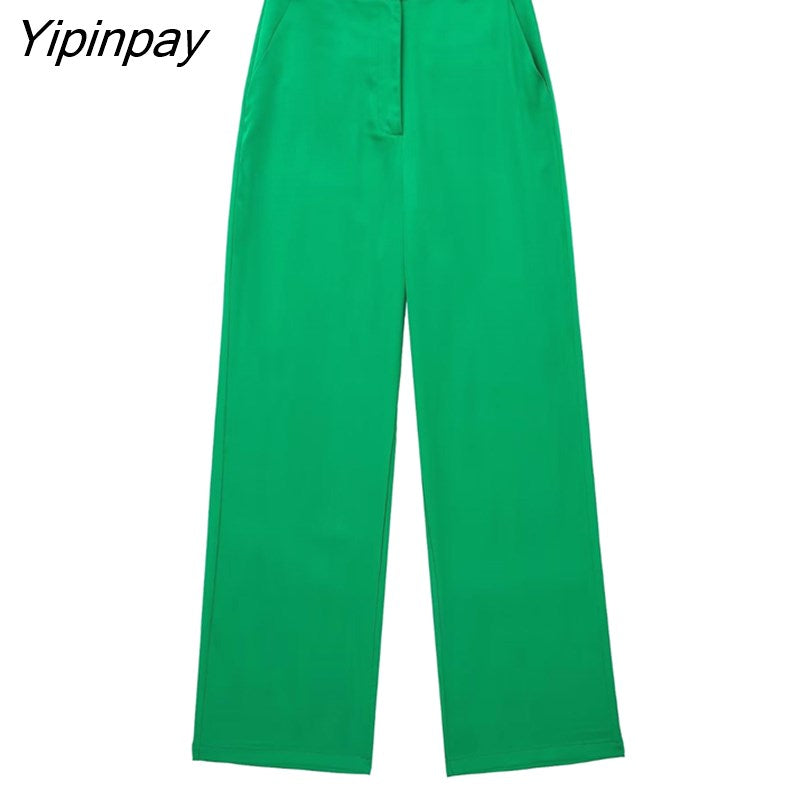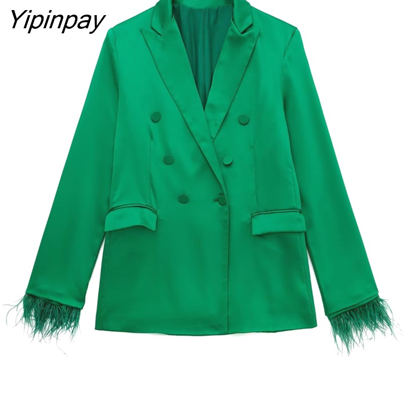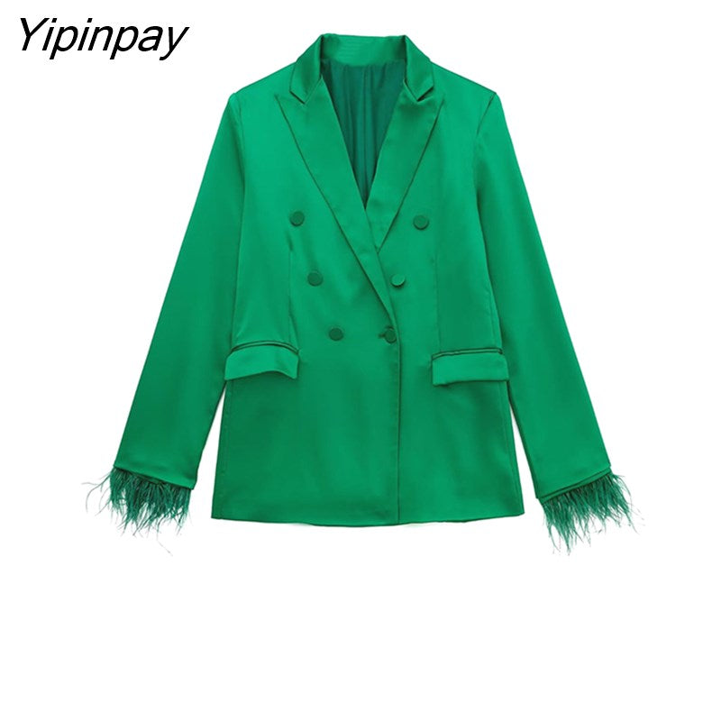 Yipinpay 2023 Women Feathers Sleeve Blazer Pant Sets Autumn Winter Double Breasted Office Outfits Jacket Zipper Trousers Outwear