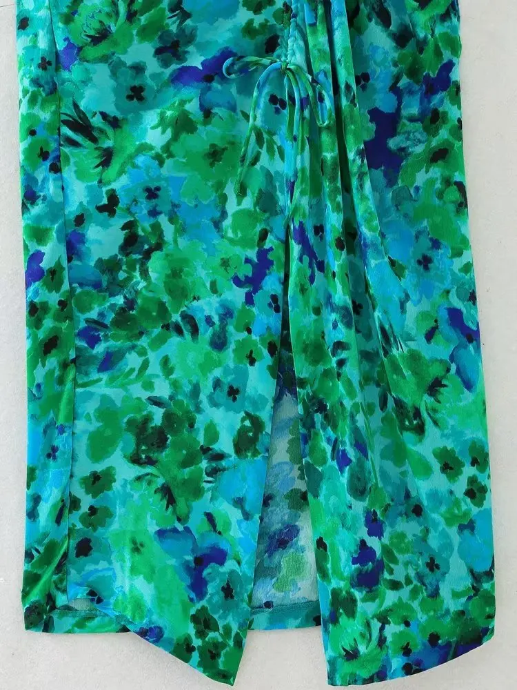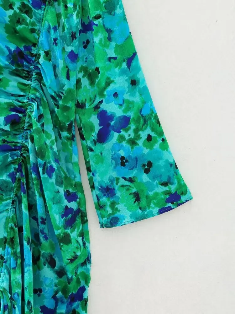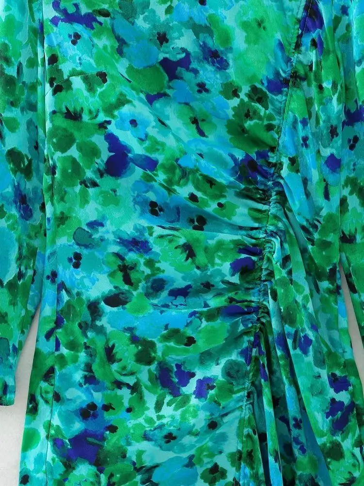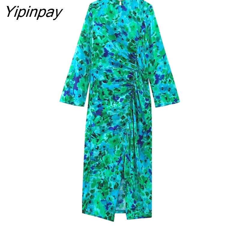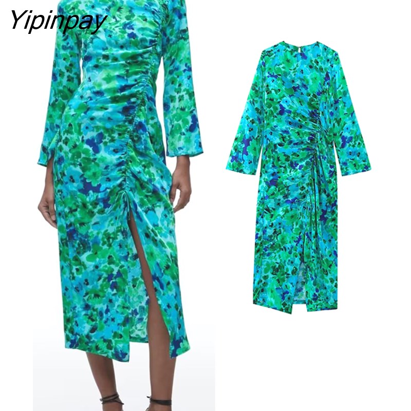 Yipinpay 2023 Women Printed Folds Mid-Calf Dresses Elegant Female Beach Style Slim Party Vestidos Long Sleeved Dresses Soft Outwear