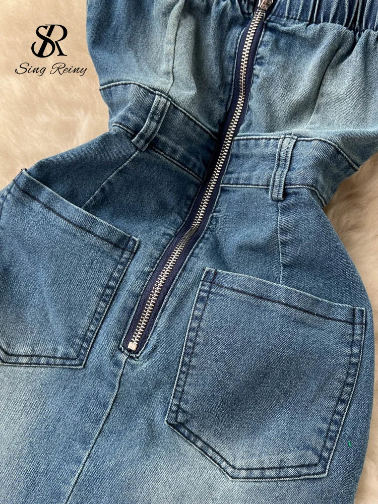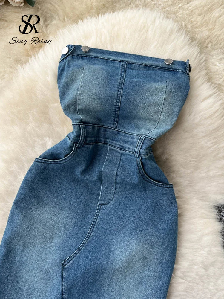 Yipinpay 2024 Strapless Sexy Denim Dress Women Off the Shoulder Slim Split Long Dress Korean Streetwear Retro Bodycon Dress