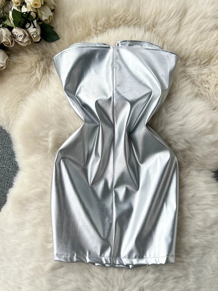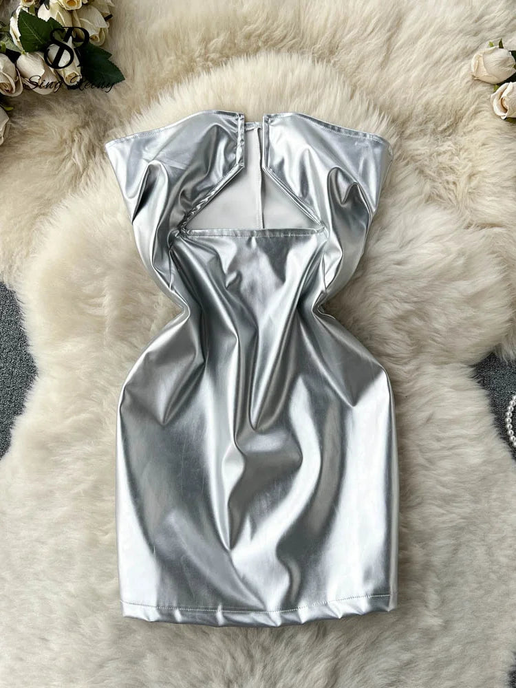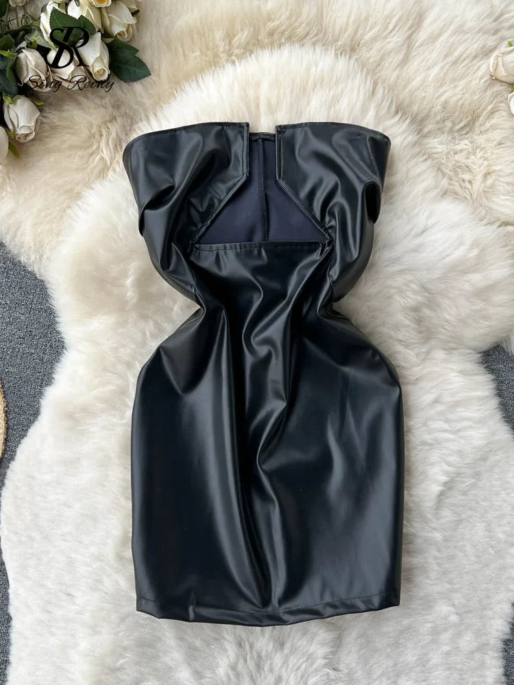 Yipinpay 2024 Strapless Sexy Short Dress Summer Sleeveless Bodycon Hollow Out Fashion Y2K Women Evening PU Leather Slim Dress