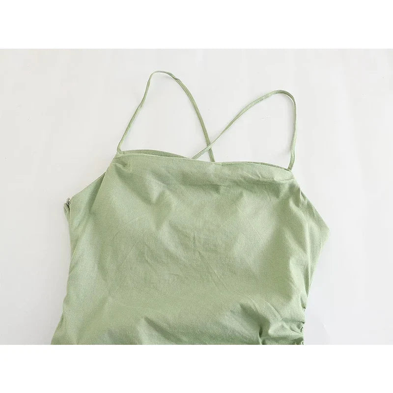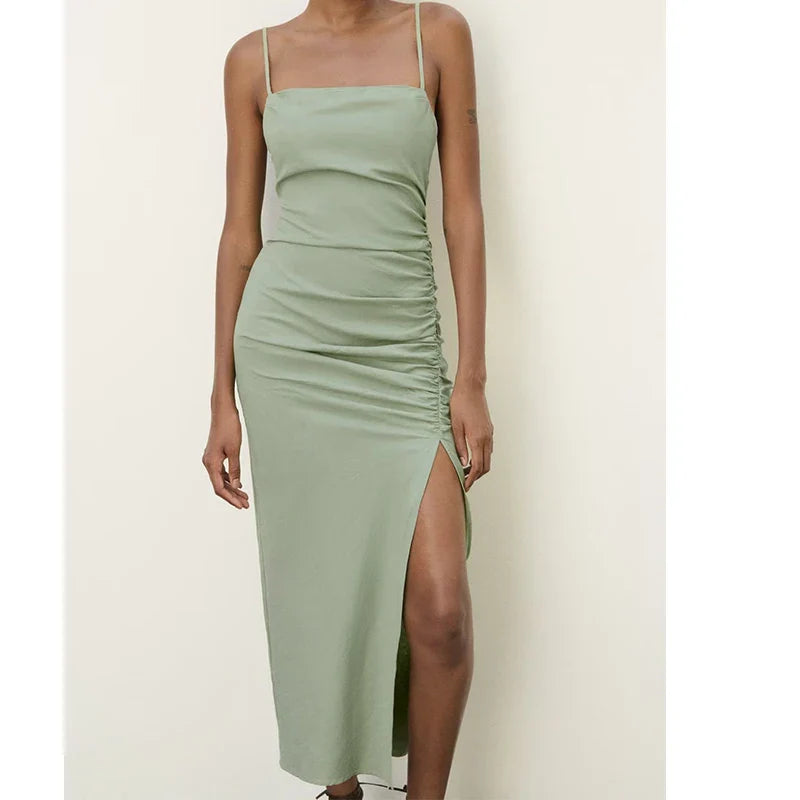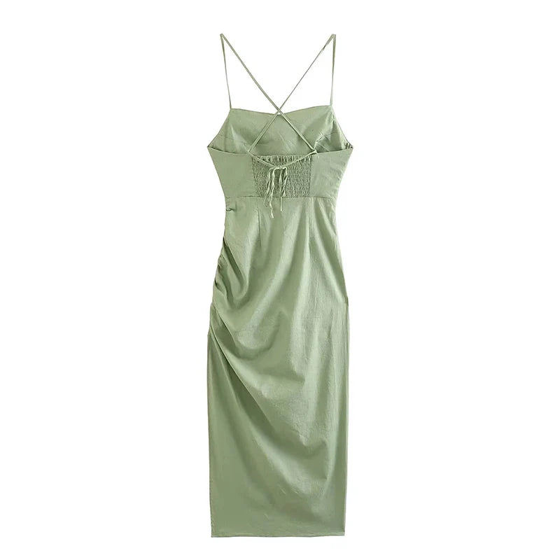 Yipinpay 2024 Women Light Khaki Side Slit Draped Midi Dresses Sexy Backless Thin Straps Female Party Summer Dress