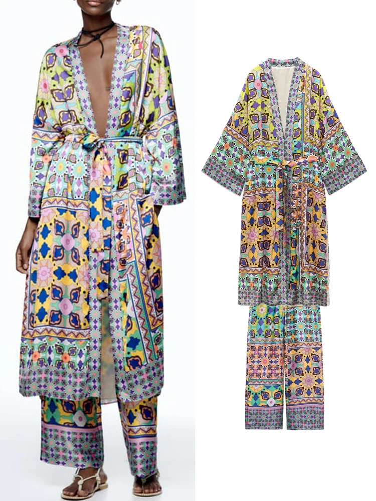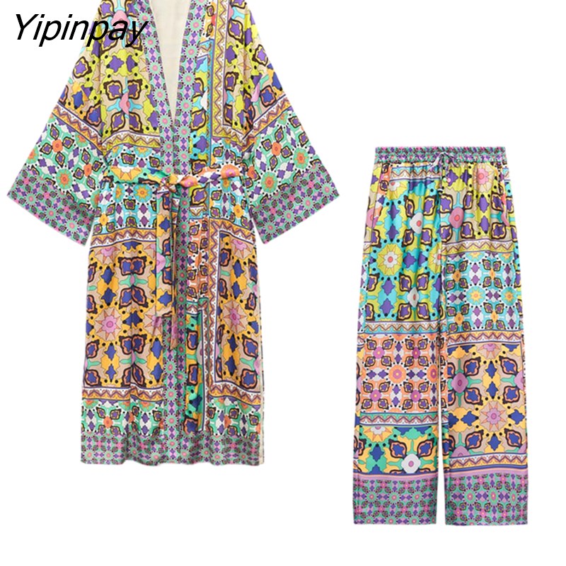 Yipinpay 2pcs Summer Women Plaid Pant Set 2023 X-Long Kimono Style Shirts With Belt+Drawstring Trousers Suit Female Casual Clothes