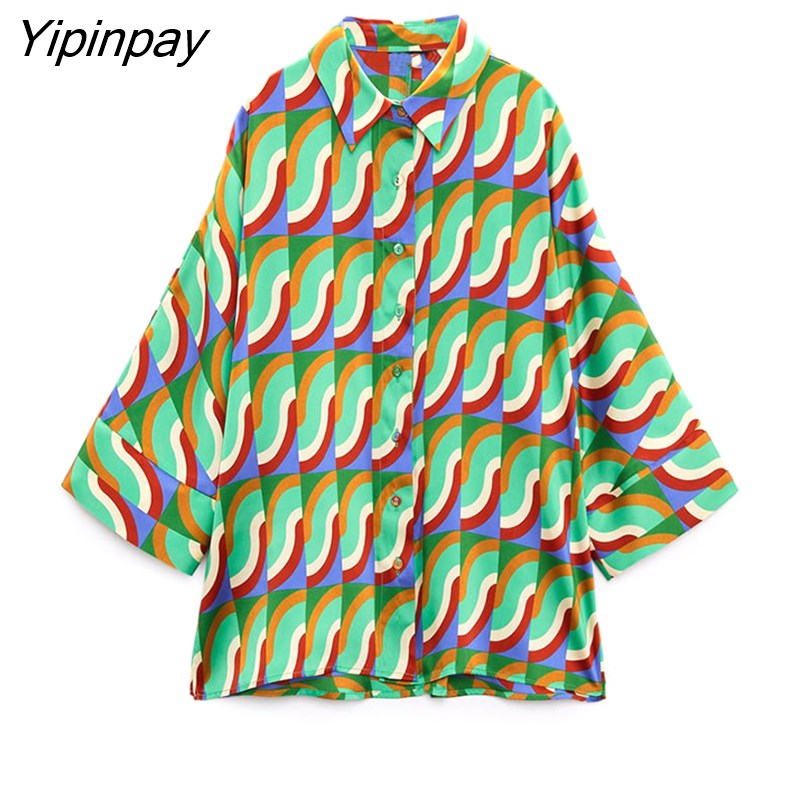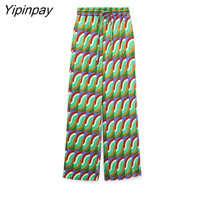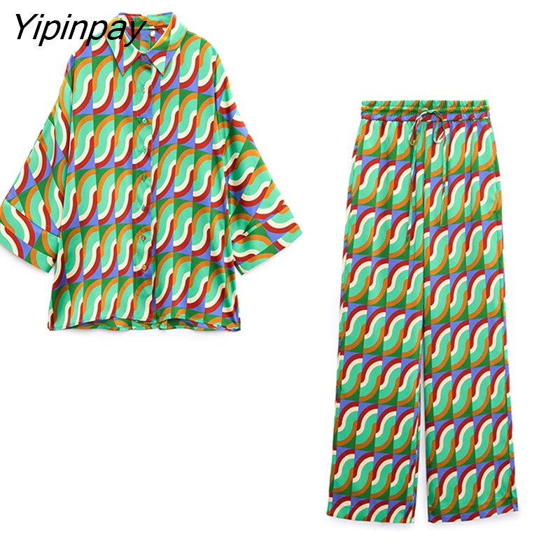 Yipinpay 2pcs Women Geometric Print Pant Shirt Sets 2023 Summer Long Sleeve Turn Down Collar Blouse+Wide Leg Trouser Causal Outwear