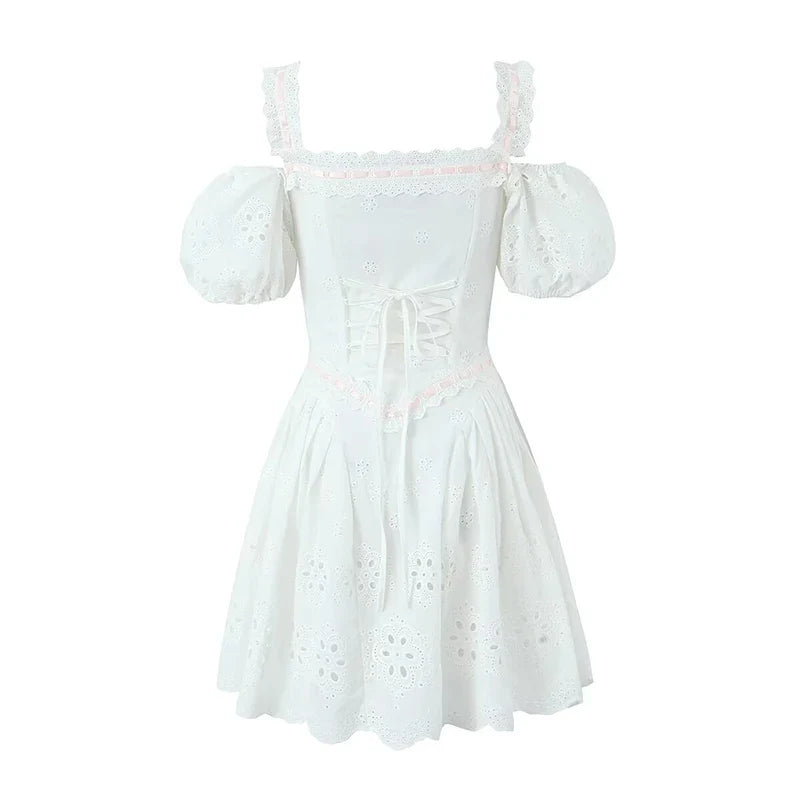 Yipinpay 3 Ways Wear White Embroidery Dress Short Puff Sleeve Mini Birthday Party Dresses Women Lacing Up Holiday Vacation Dress