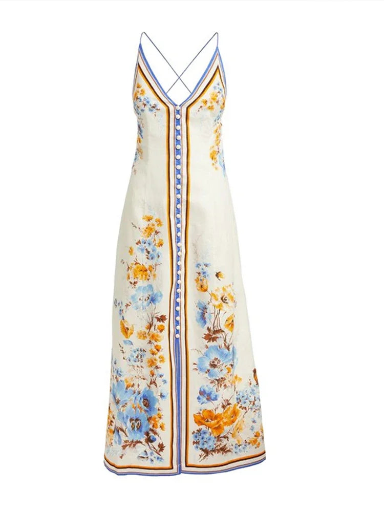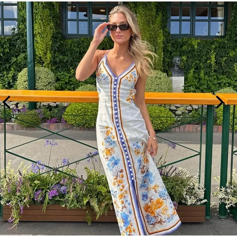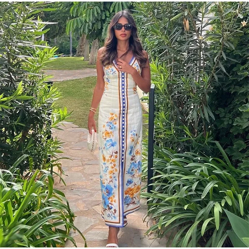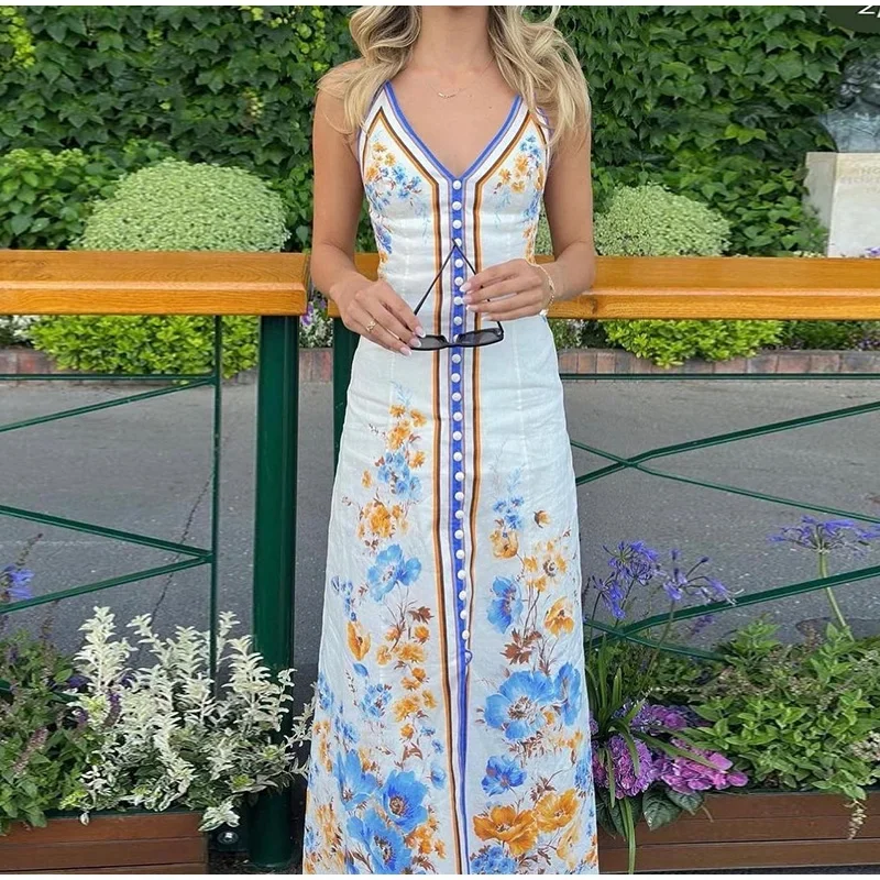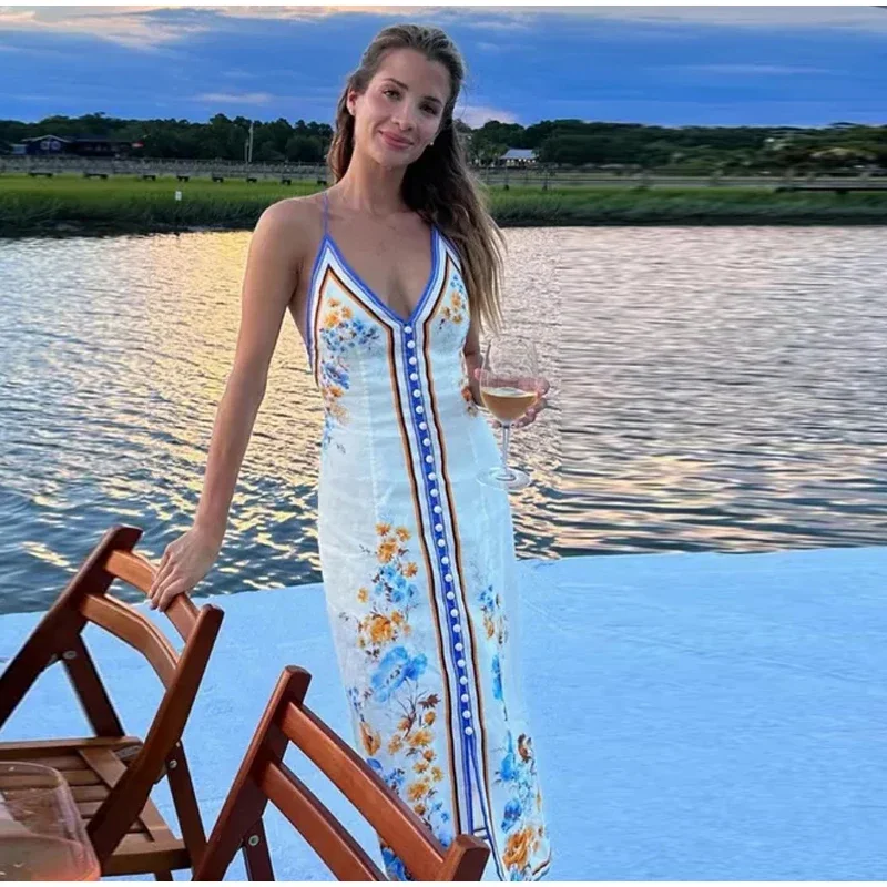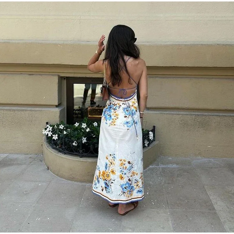 Yipinpay A-line Floral Print Long Dress Women 2024 Summer Sleeveless Backless Maxi Dresses Female Chic Vacation Beach Lady Robes
