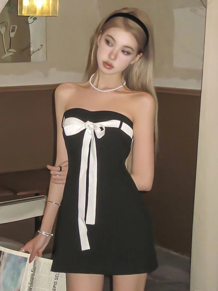 Yipinpay Aesthetic Sexy Sweet Dress Women Mall Gothic Streetwear Fairycore Strapless Bow Patchwork High Waist Mini Dress Female