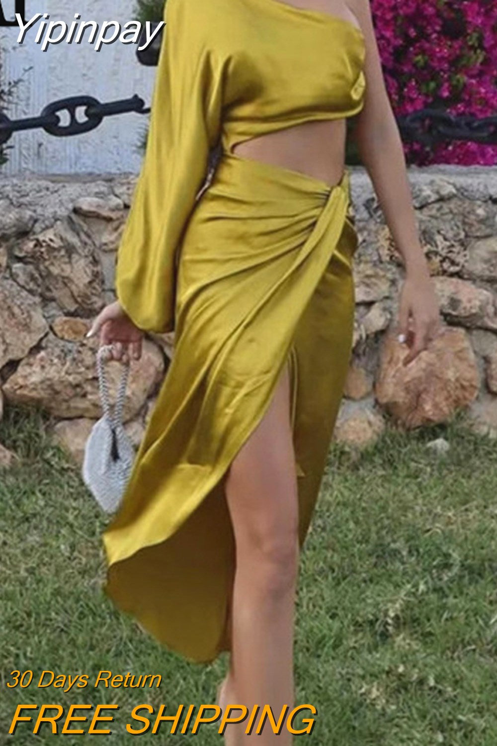 Yipinpay Asymmetric Long Dress Women Cut Out Satin Dress Woman Ruched One Long Sleeve Elegant Dresses Off Shoulder Party Dresses