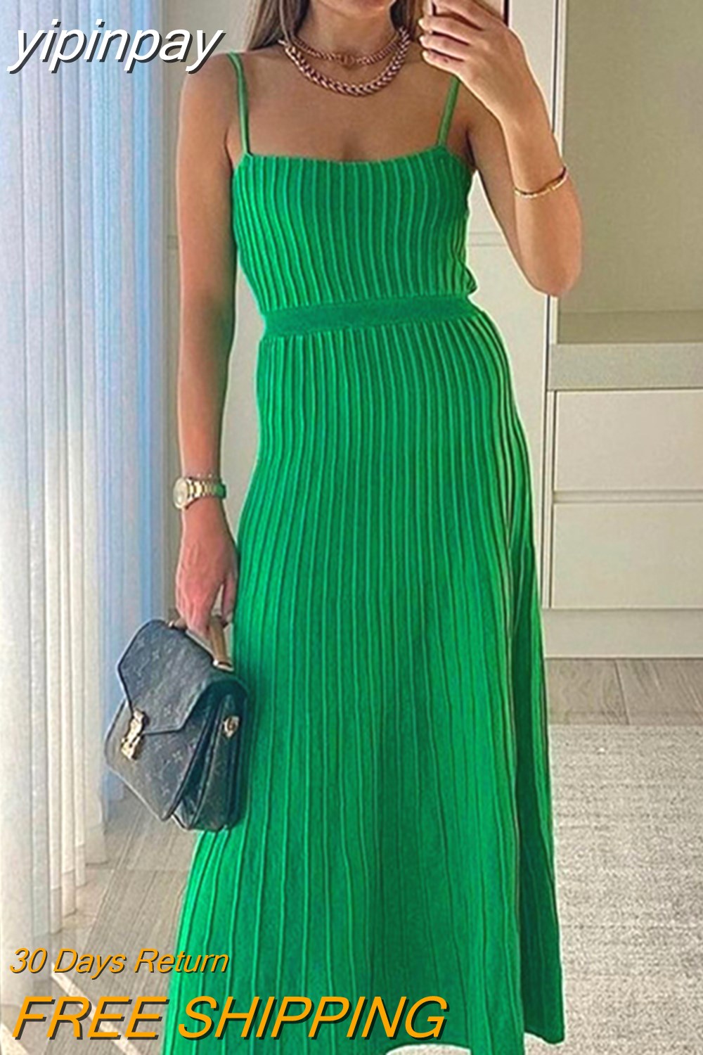 yipinpay Autumn 2023 Knitted Strap Blue Sweater Dress Maxi Backless Women Y2K Summer Sexy Club Long Pleated Dress Elegant