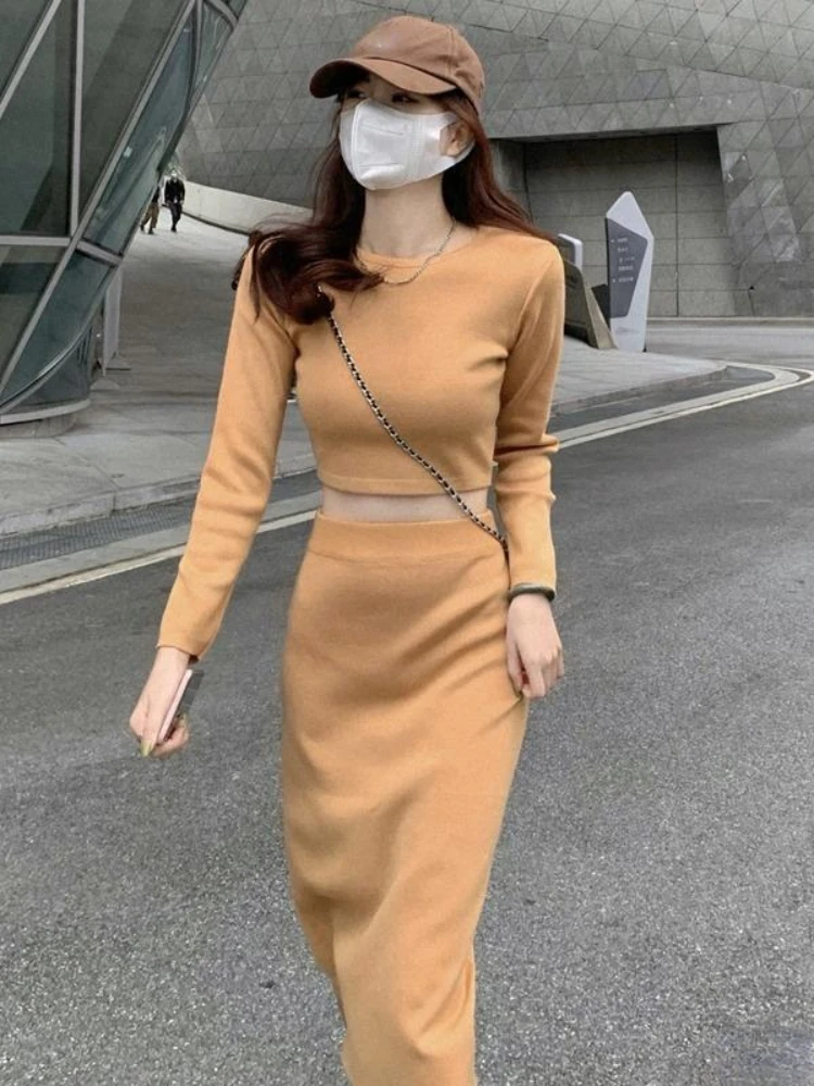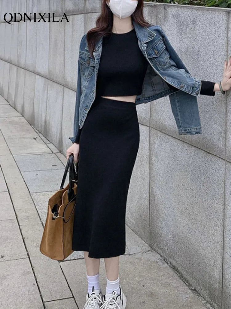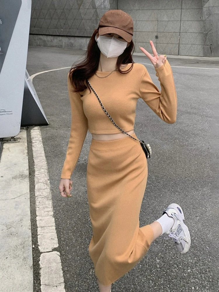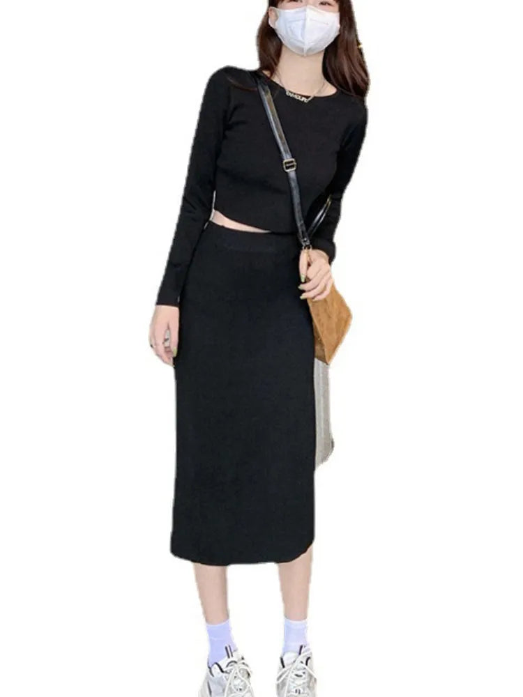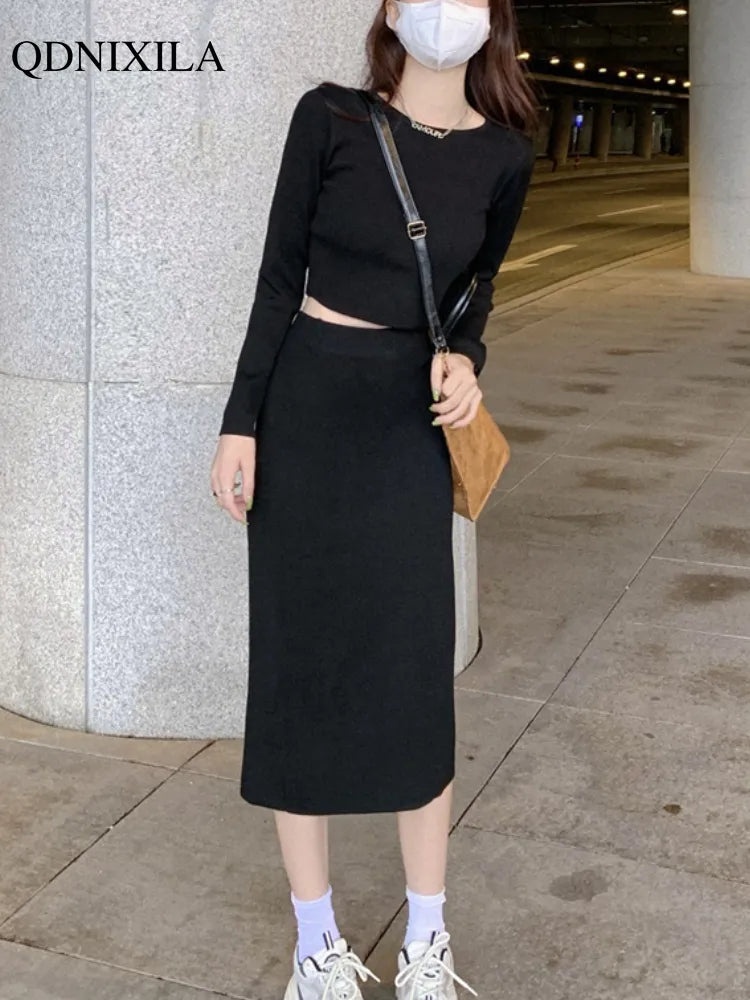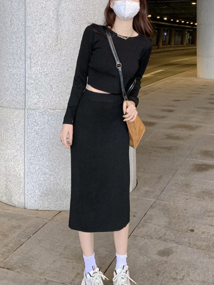 Yipinpay Autumn 2023 New Women's Skirt Suit Vintage Sexy Elegant Fashion Short Long-sleeved T-shirt Top and Midi Skirt 2-piece Set