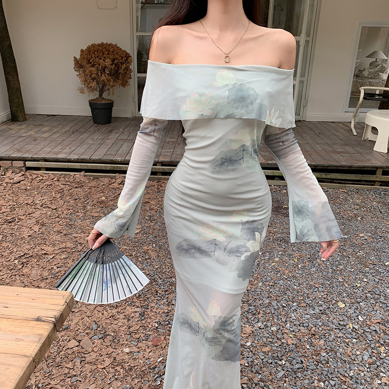 Yipinpay Autumn New Style Elegant Slim Bag Hip Skirt Fashion Net Cloth Printed Shoulder Dress For Women