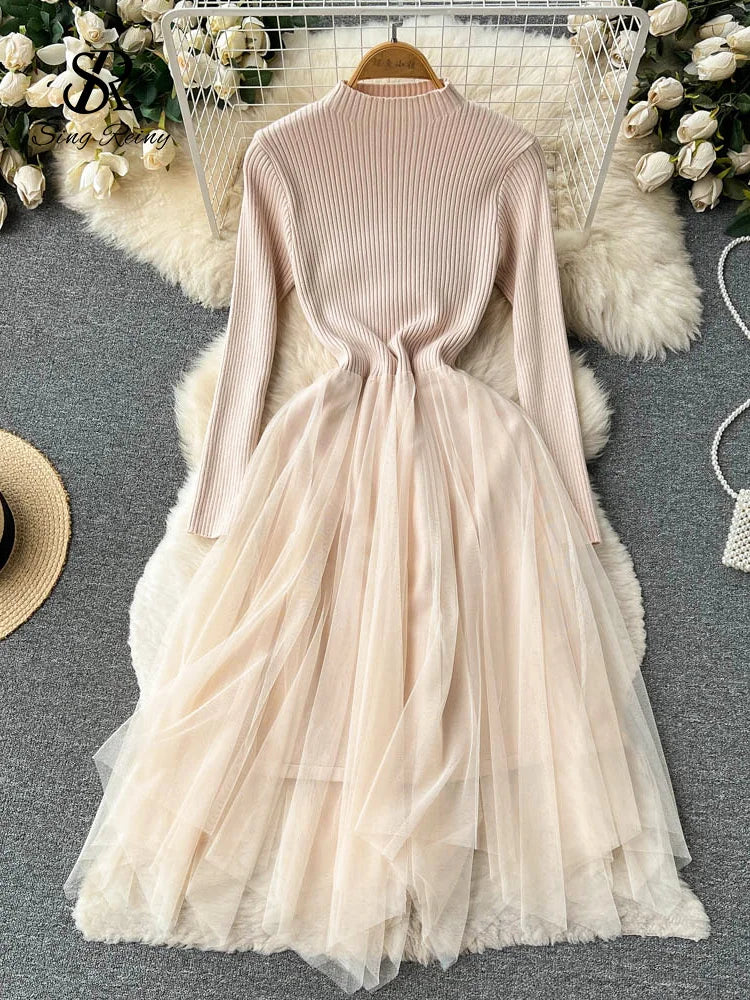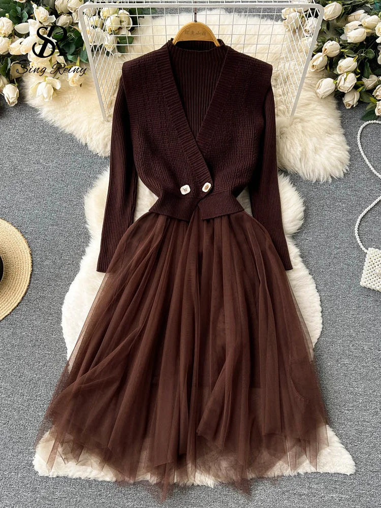 Yipinpay Autumn Solid Knitted Long Dress Women Warm Vest+Long Sleeves Mesh Patchwork Thick Sweater Dress Two Pieces Suits