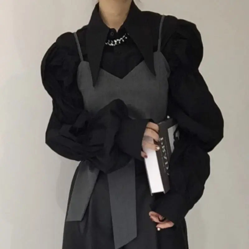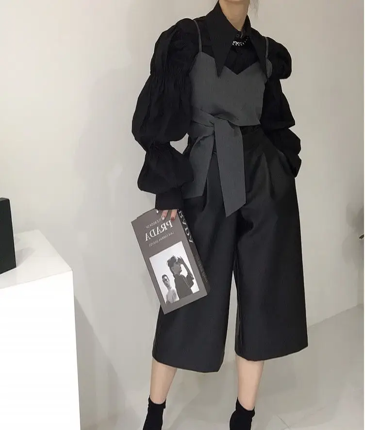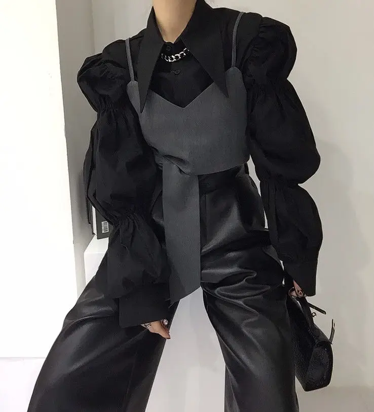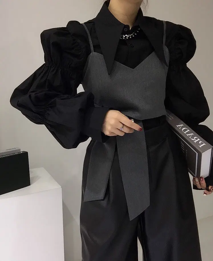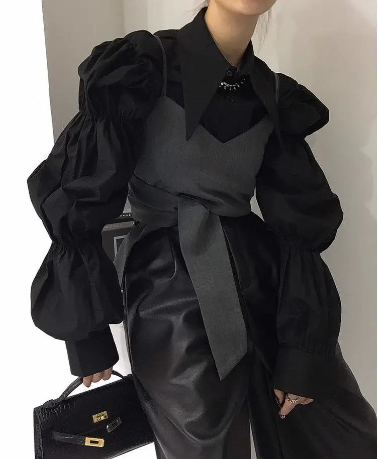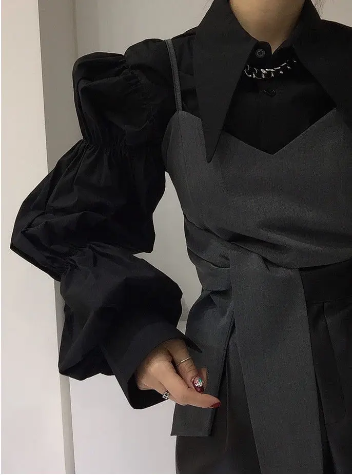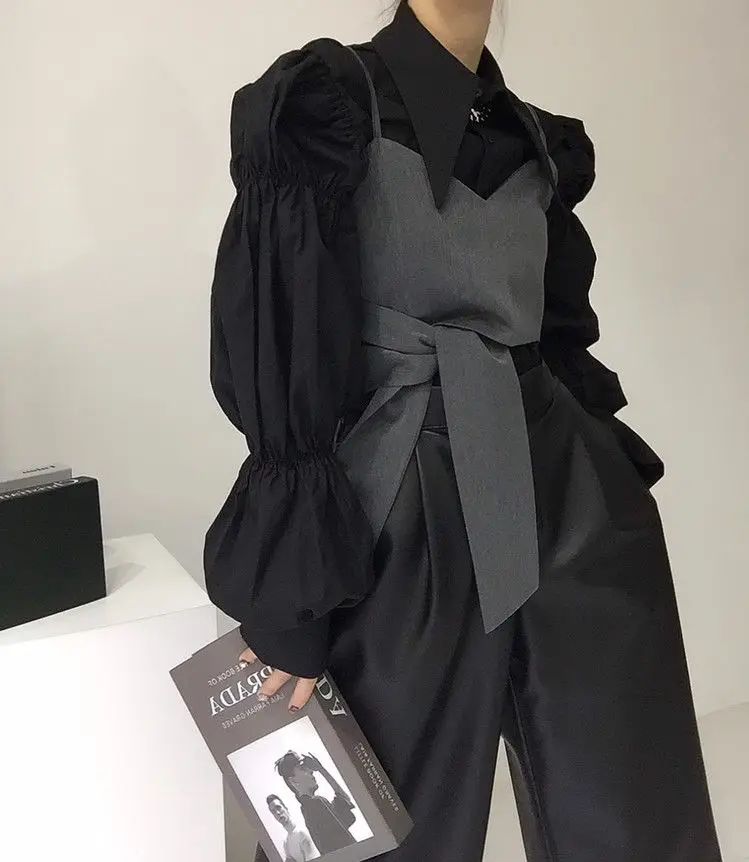 Yipinpay Autumn Turn Down Collar Shirt Lantern Sleeve Blouse Casual Top Bandage Grey Camisole Camisas De Mujer Blusas