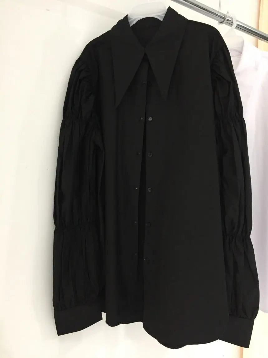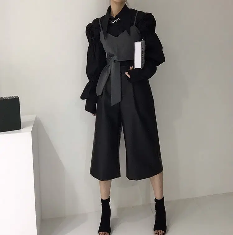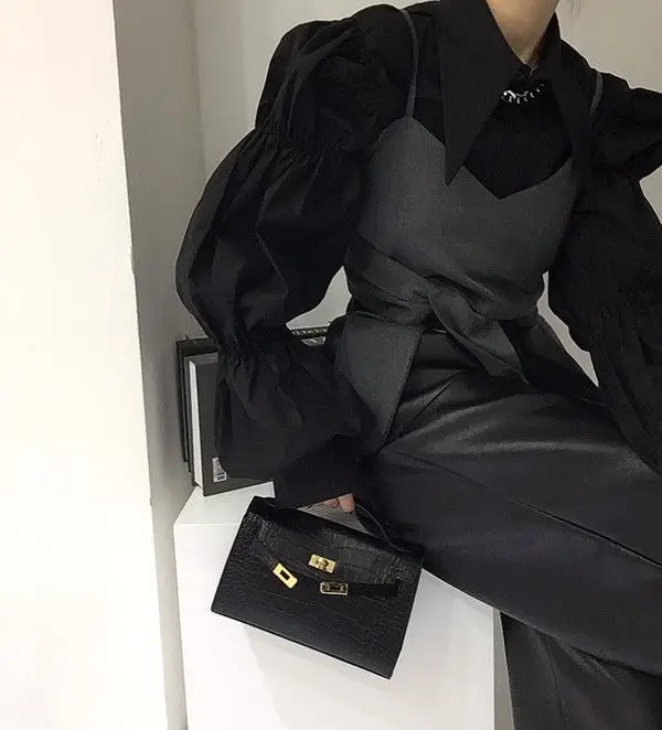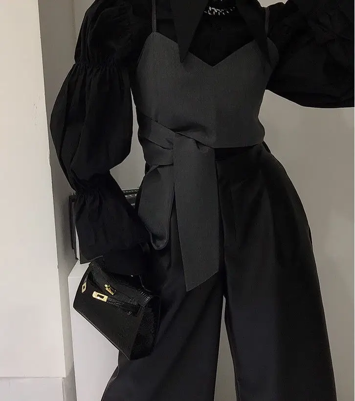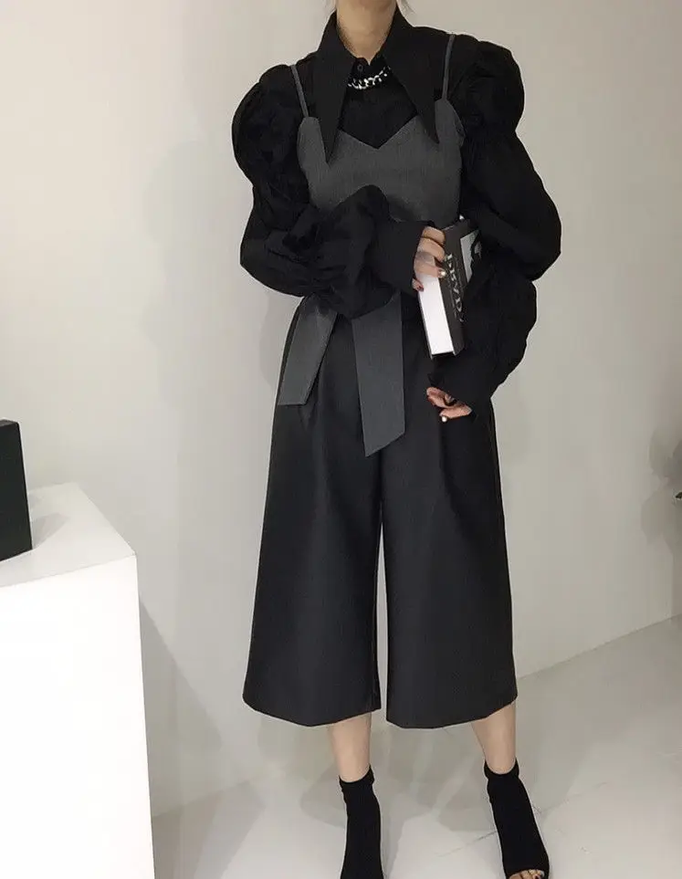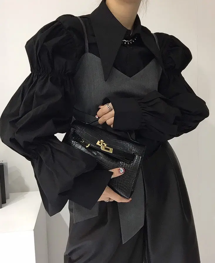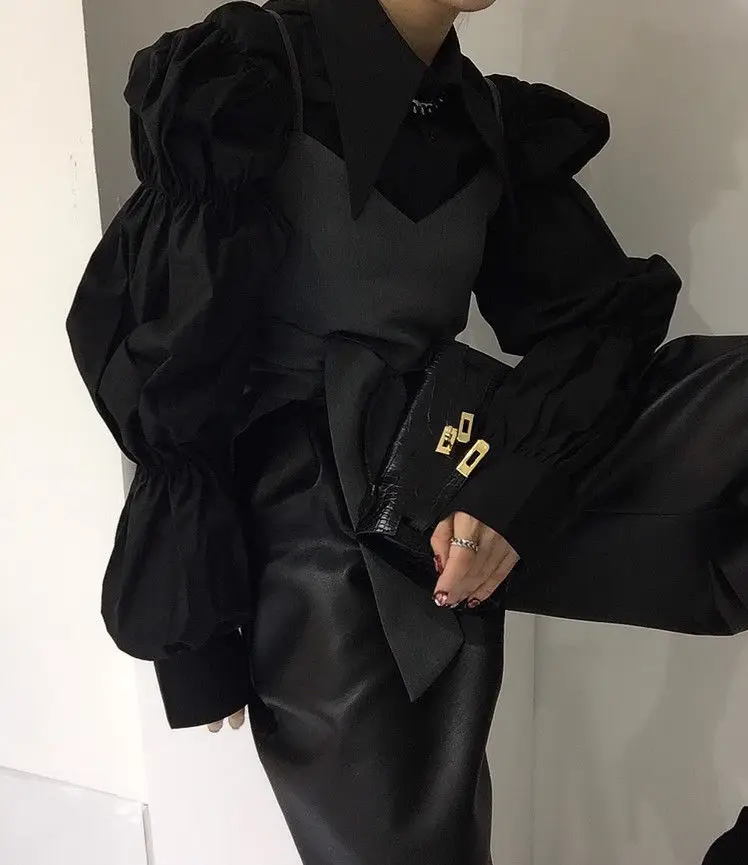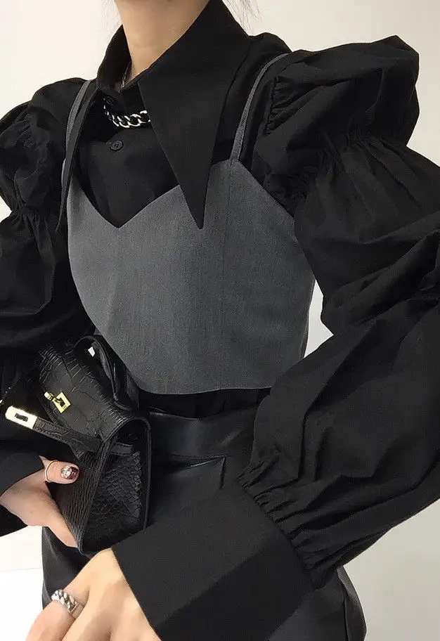Yipinpay Autumn Turn Down Collar Shirt Lantern Sleeve Blouse Casual Top Bandage Grey Camisole Camisas De Mujer Blusas