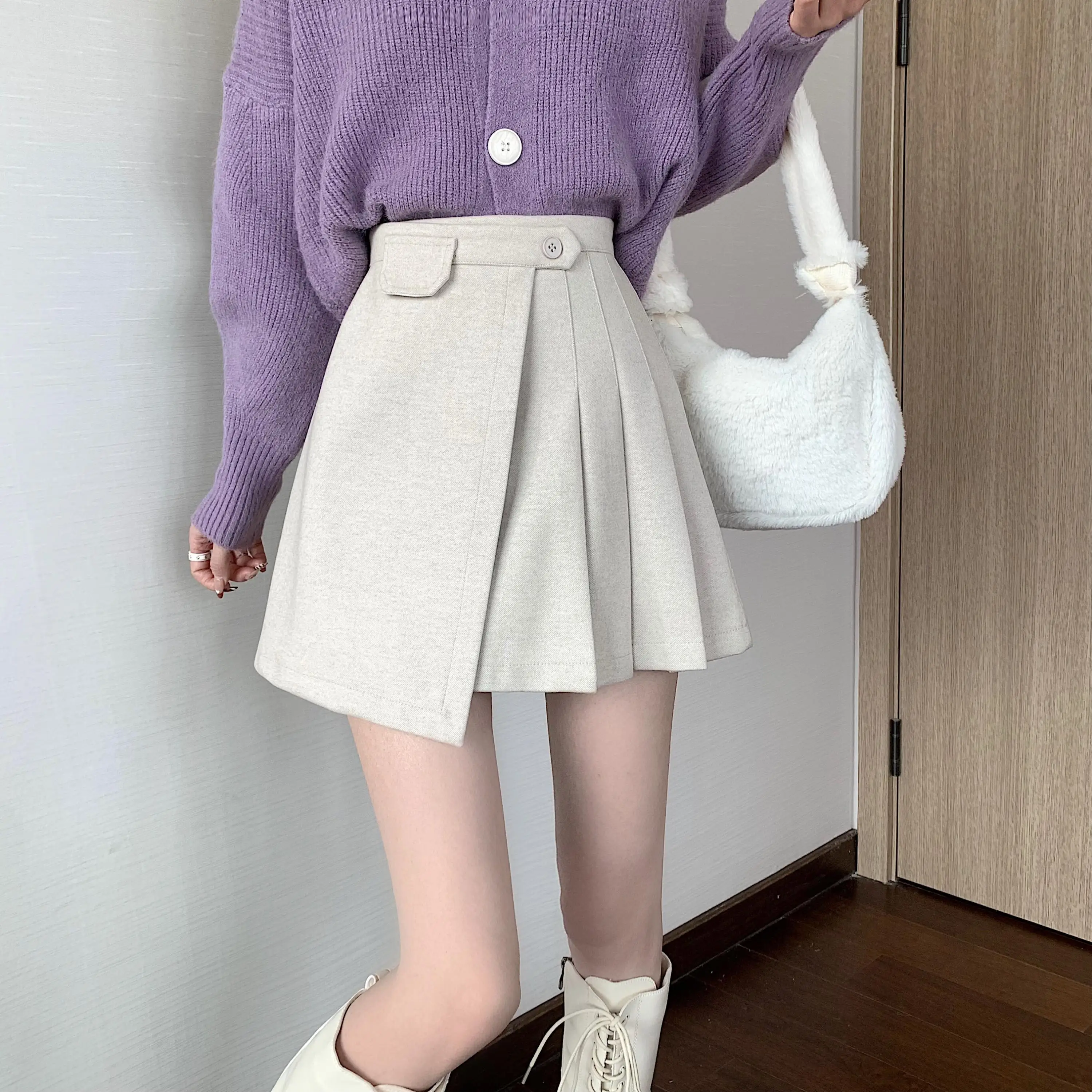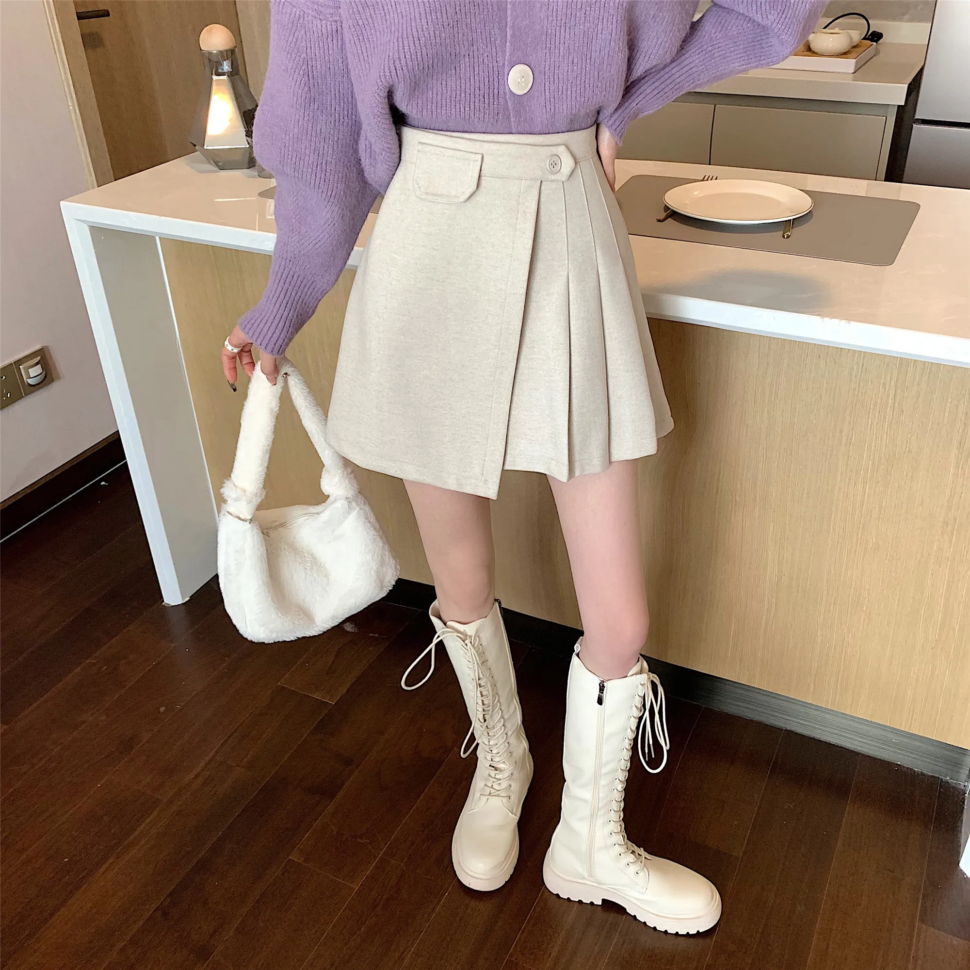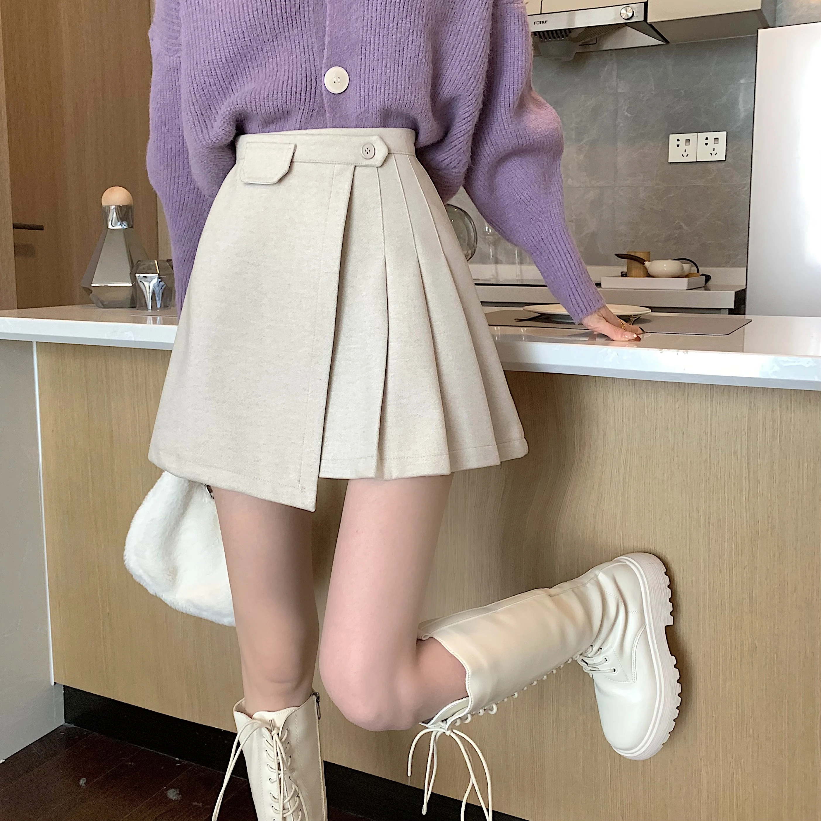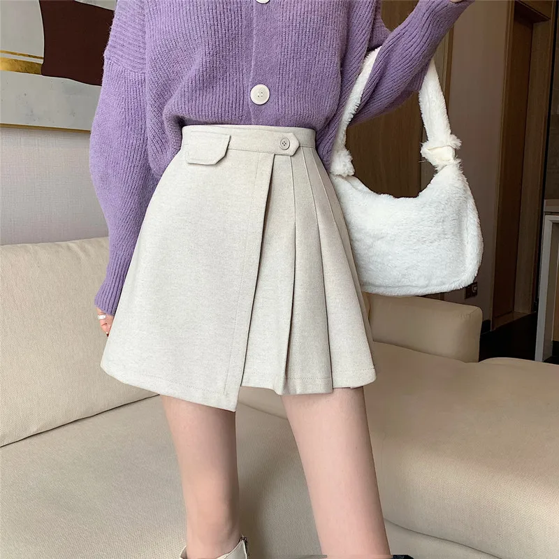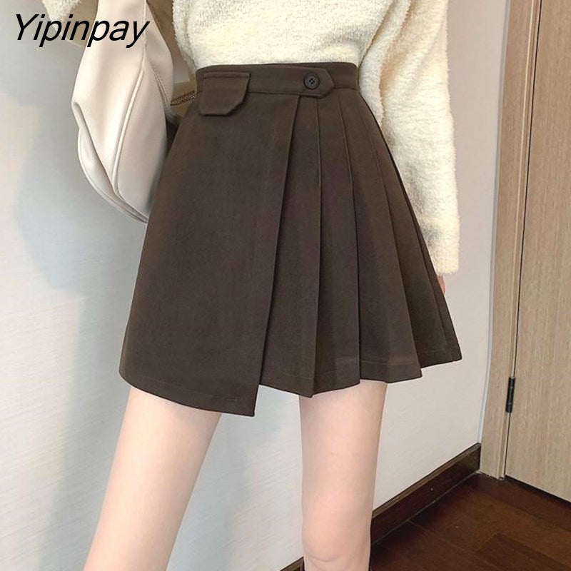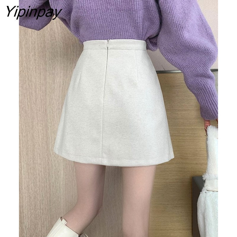 Yipinpay Autumn Winter Apricot Woolen Skirt Women High Waist Pleated Skirt
